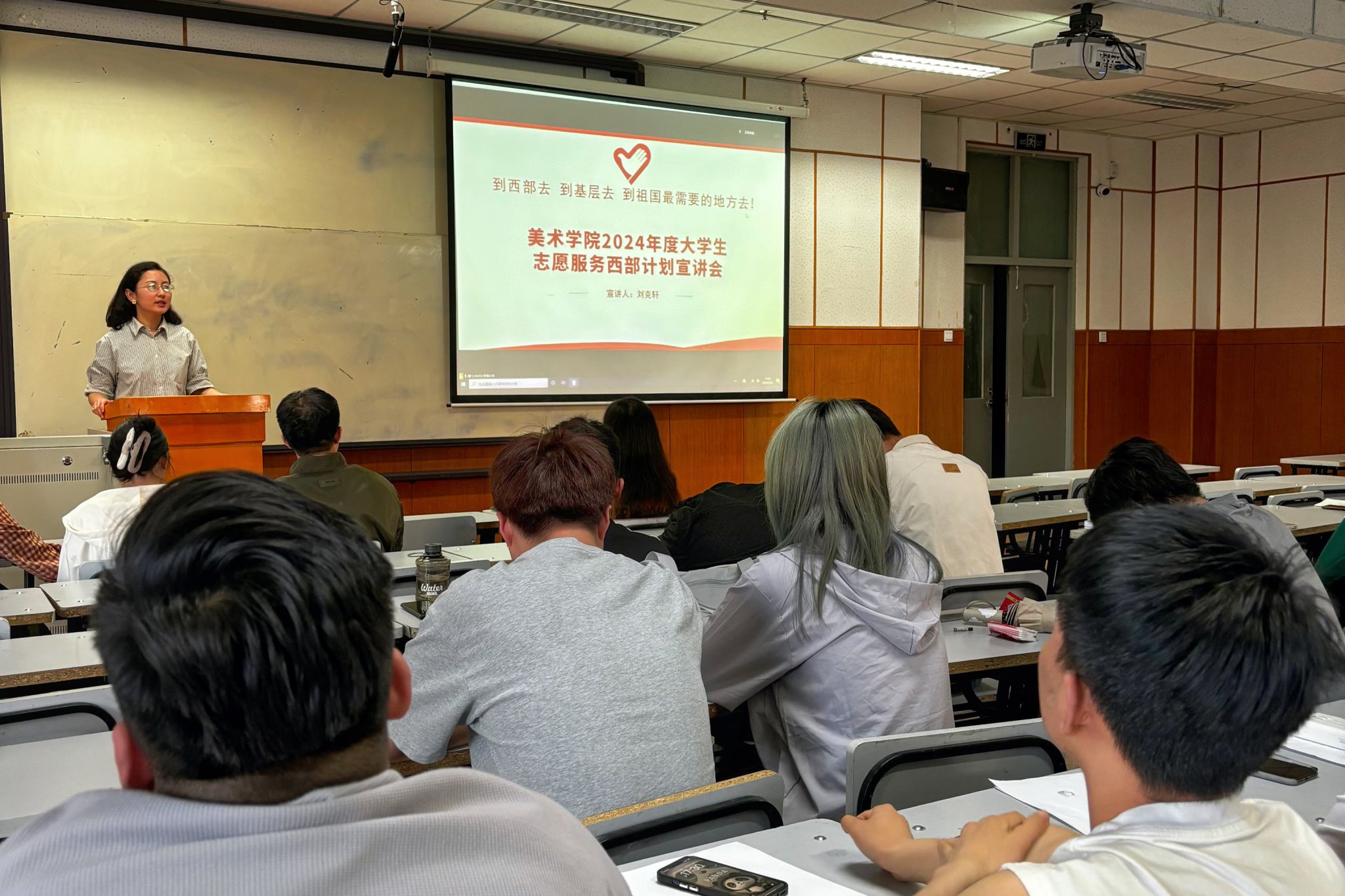为进一步培养大学生的社会责任感和家国情怀,更加深入地了解国情、民情,引导大学生为推动国家的区域发展,积极投身到西部地区贡献青春力量,美术红黑游戏 于2024年4月25日下午在文津楼203教室开展大学生志愿服务西部计划宣讲会,由美术红黑游戏 2021届环境设计专业校友、西部计划志愿者刘克轩主讲,团委书记王媛媛主持,《就业指导》任课教师邵莉媛和大三、大四年级学生参加。