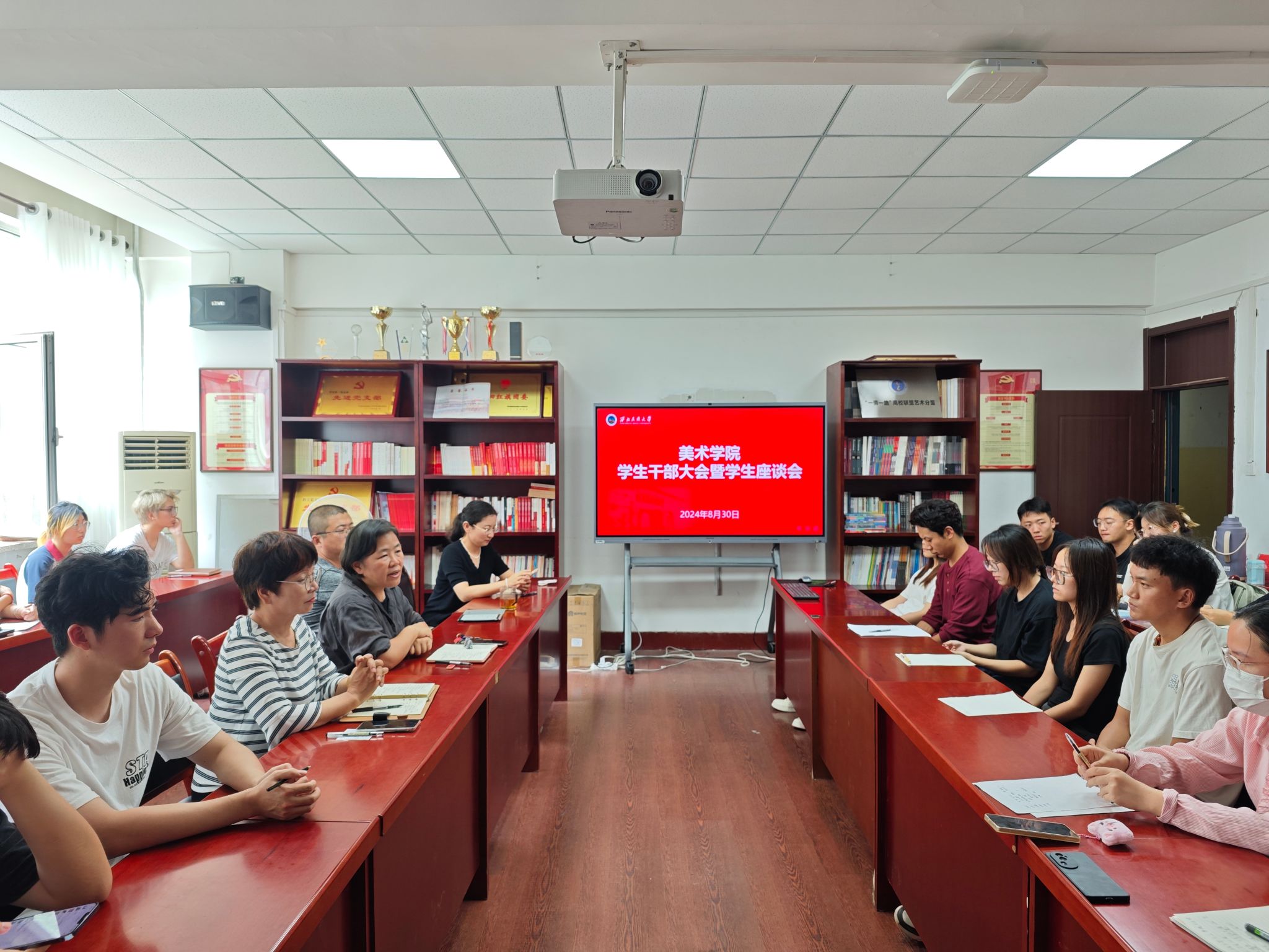为提高学生干部的素质能力,更好地发挥模范带头作用, 2024年8月30日下午,美术红黑游戏 在美术楼209会议室召开学生干部大会暨学生座谈会,院长徐海翔、副书记铁英秀、副院长冯炳超及学生干部参加,会议由团委书记王媛媛主持。