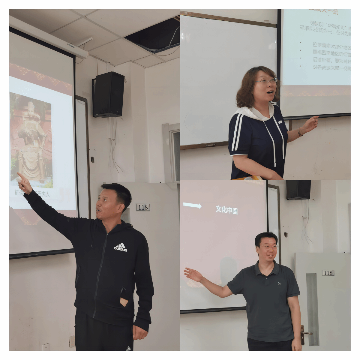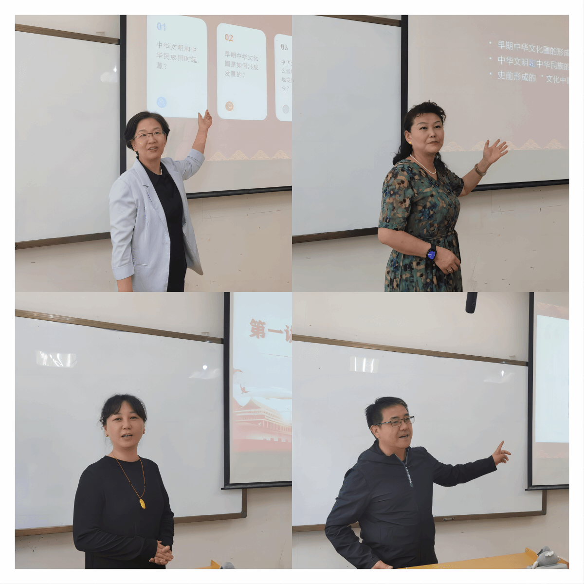 在说课、讲课环节,教师们结合自身特点,在准确理解《中华民族共同体概论》教材的基础上,运用案例切入、问题启发、小组讨论等教学手段,开展相关章节的课堂教学。栗学钟老师通过“何为桃花石”的问题启发和案例切入,引导学生理解中华民族在辽宋夏金时期的内聚性发展特点。冯瑞老师结合文明初现与中华民族起源这一章的教学内容,详细阐述早期中华文化圈的形成与发展,以及中华民族的起源及其多元一体特征。昂秀措老师以凌家滩与牛河梁遗址的玉人等玉器和彩陶为纽带,展现早期中华文化圈的案例,引导学生探索史前文明与中华民族起源特征及发展格局。王硕老师通过“五胡入华”的“入”字为切入点,引导学生们认识到各民族交流互动、共创中华是魏晋南北朝时期历史发展的主要特点。马英杰老师结合明朝各民族共御外辱的事实,分清历史起点,深入阐释中华民族历史观。扈永辰老师从几个关键词入手,厘清夏商周时期天下秩序的建立过程与华夏共同体的形成脉络。