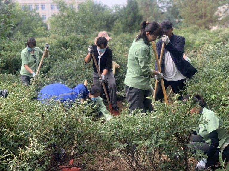 当天下午,在榆中校区教工公寓旁的牡丹园开展的护绿除草劳动如火如荼,后勤员工用自己朴实的劳动表达了尽心为师生服务、努力为老师们创设优美休闲空间的赤诚之心。
