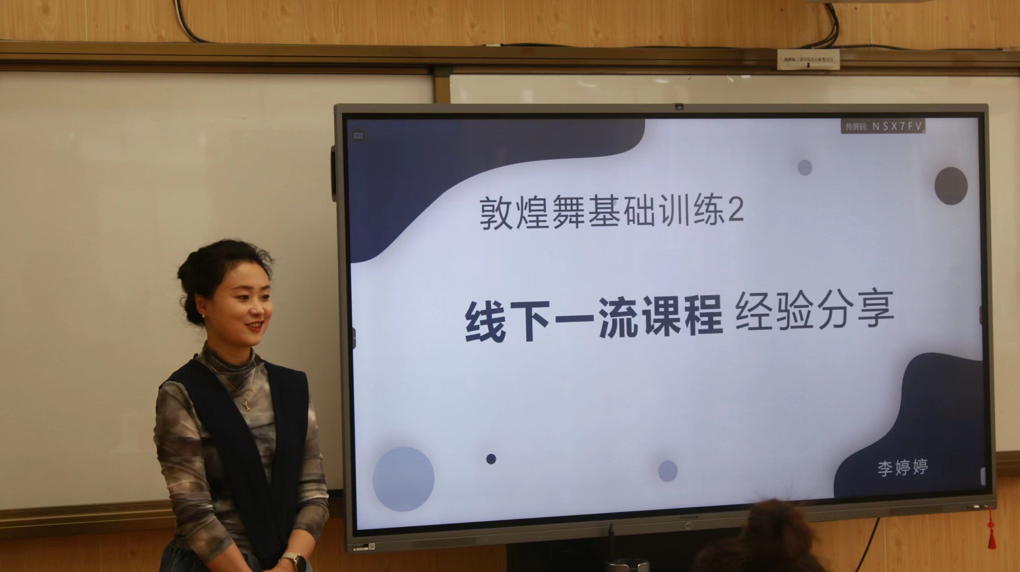 国家级一流线下课程《敦煌舞基础训练》的负责人李婷婷教授从国家级一流本科课程申报策略角度,分享课堂实录过程中要“以成效说话,以数据说话,以问题为导向”,要突出课程的独创性、体现教学手段的多元化、教学内容的与时俱进,要针对教学过程中遇到的“教学内容单一、基础知识理论高、教学模式陈旧、不能满足社会与就业需求、教学手段固化、学习内驱力不足”等教学痛点问题,立足社会就业现实,以需求为导向,创设教、创、学、研一体化教学模式对标解决痛点问题。最后以展示她的说课视频如何诠释课程的高阶性、创新性和挑战度结束了她的分享。