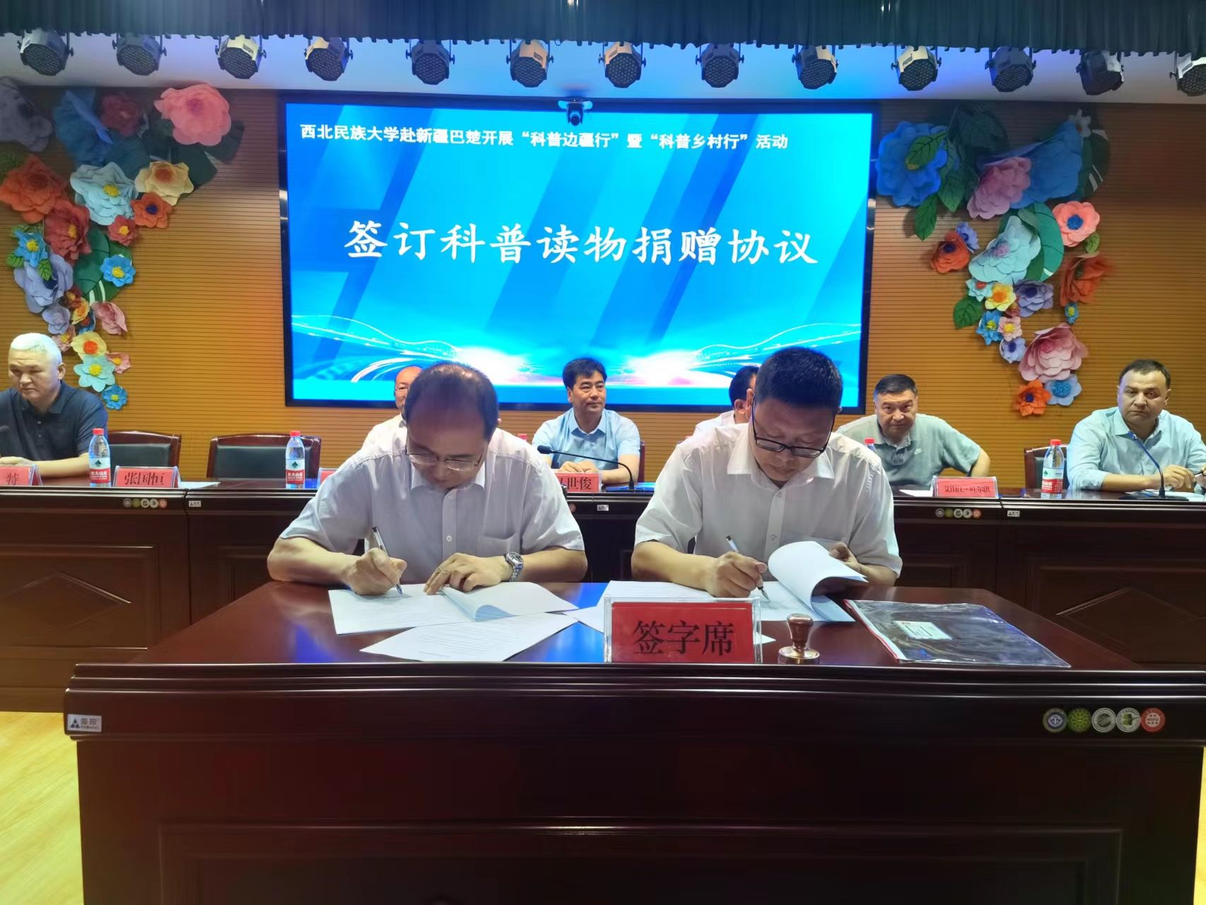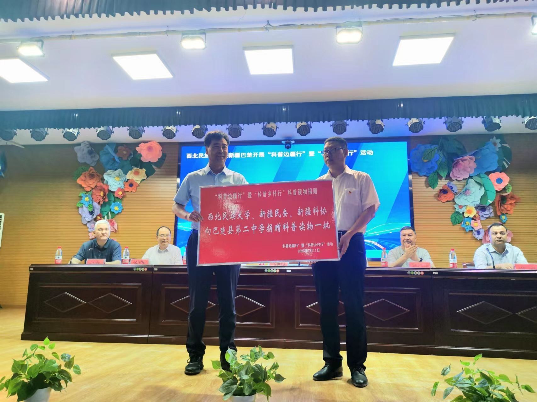 党委常委、副校长马世俊向巴楚县二中了捐赠了科普读物。科研处副处长张国恒教授与巴楚县二中校长赵磊签订了科普读物捐赠协议。新疆科协为各活动点赠送了科普资源包和科普读物。