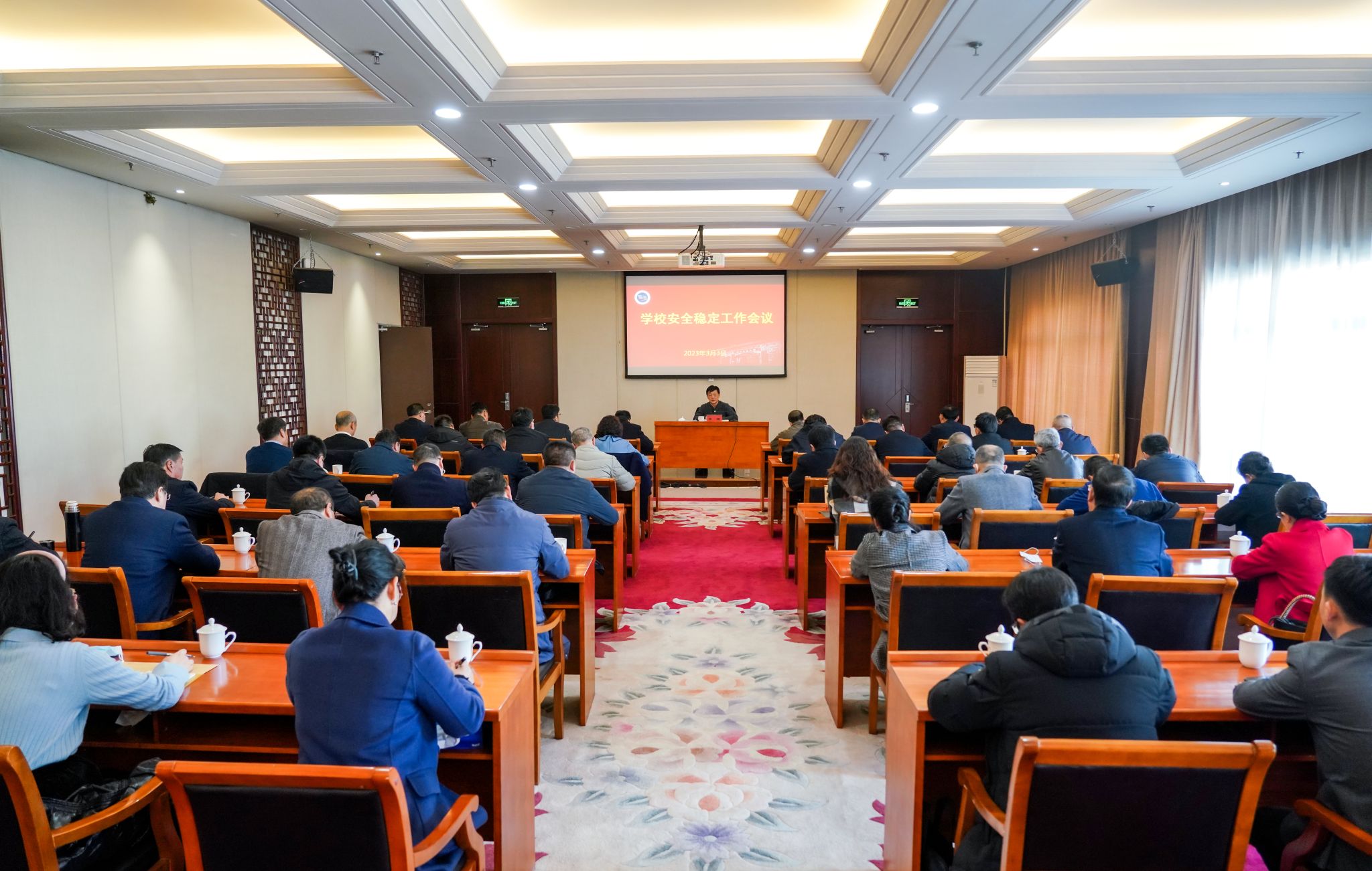 在西北新村校区礼堂三楼会议室召开2023年校园安全稳定工作会议,党委副书记、副校长李辉主持会议,校属各职能部门主要负责同志,各红黑游戏