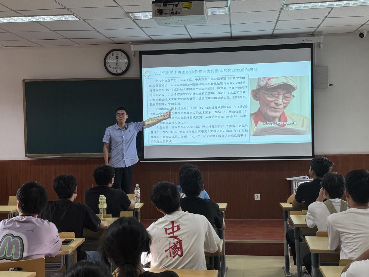 班会上,班导师领学了理论文章《学习进行时丨中国共产党的中流砥柱作用是抗战胜利的关键》《习近平委托中央组织部负责同志向游本昌转达勉励和问候》,引导学生从历史中汲取奋进力量。