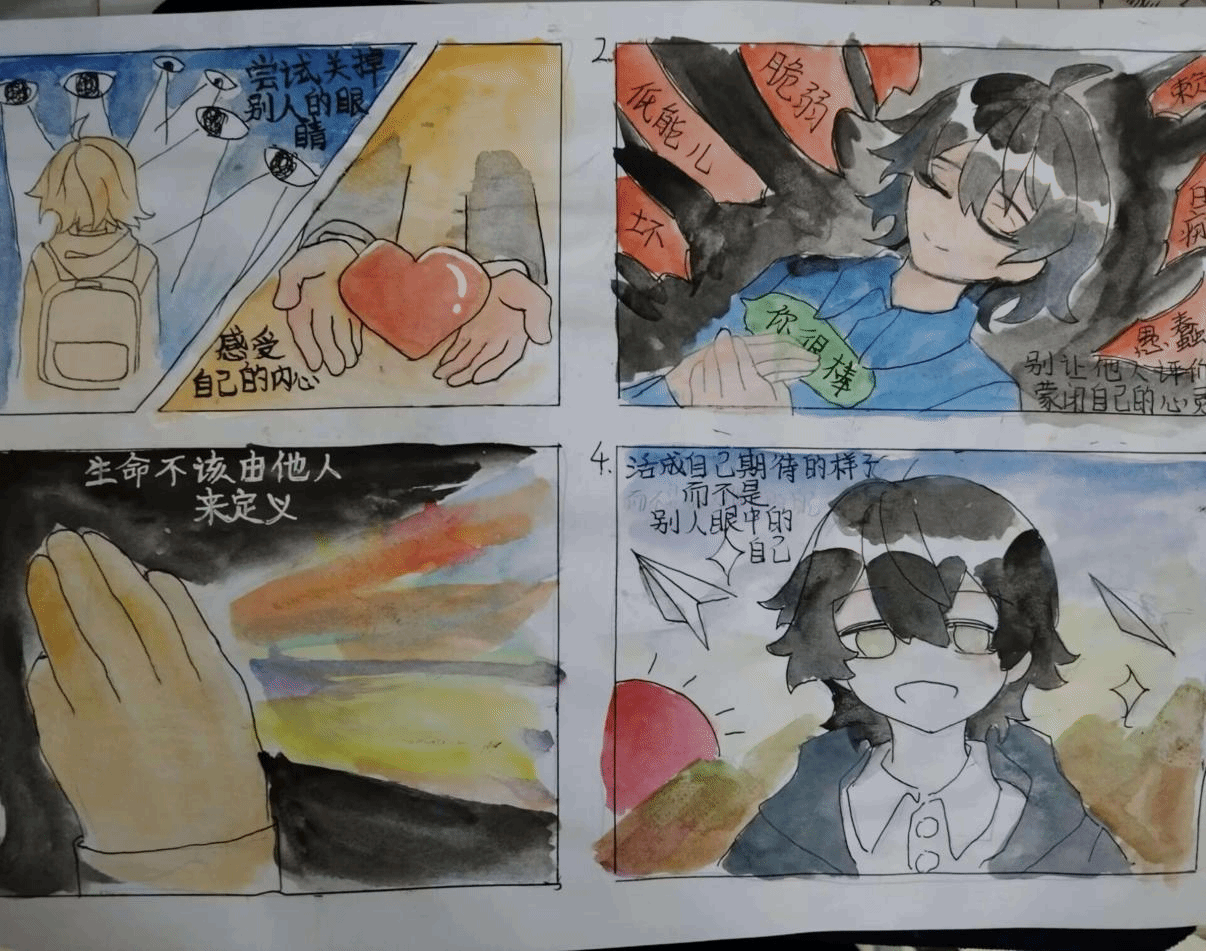 “心田细雨·资助繁花”漫画比赛特设了心理健康赛道与资助赛道,吸引了众多同学踊跃参与、尽情创作。大家以笔为媒、以画传情,将情绪管理、压力应对等心理主题转化为一幅幅生动鲜活的画面。其中《情绪调色盘》凭借独特创意脱颖而出,作品将不同情绪比作缤纷色彩,生动传递出“接纳每一种情绪,才能绘制专属精彩人生”的积极理念。参赛同学纷纷表示,漫画创作的过程,既是一次天马行空的创意表达,更是一场与自我对话的治愈之旅。