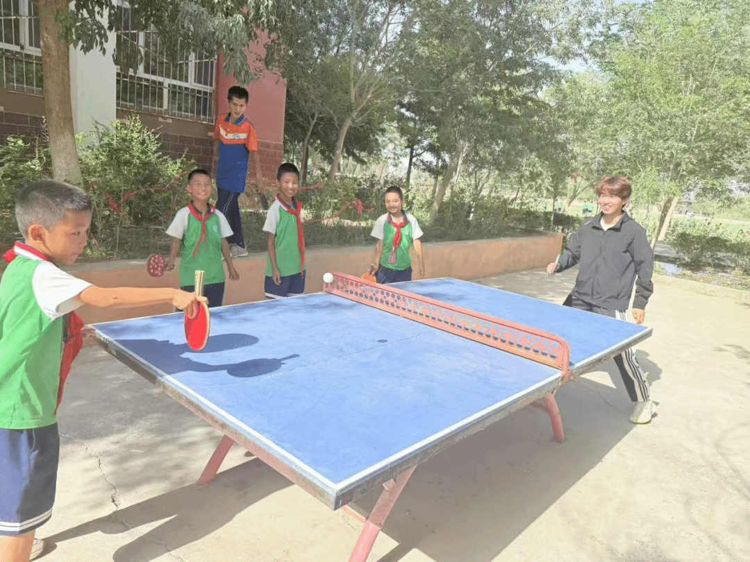 图8:在大课间,两位同学和小学生们切磋乒乓球技术