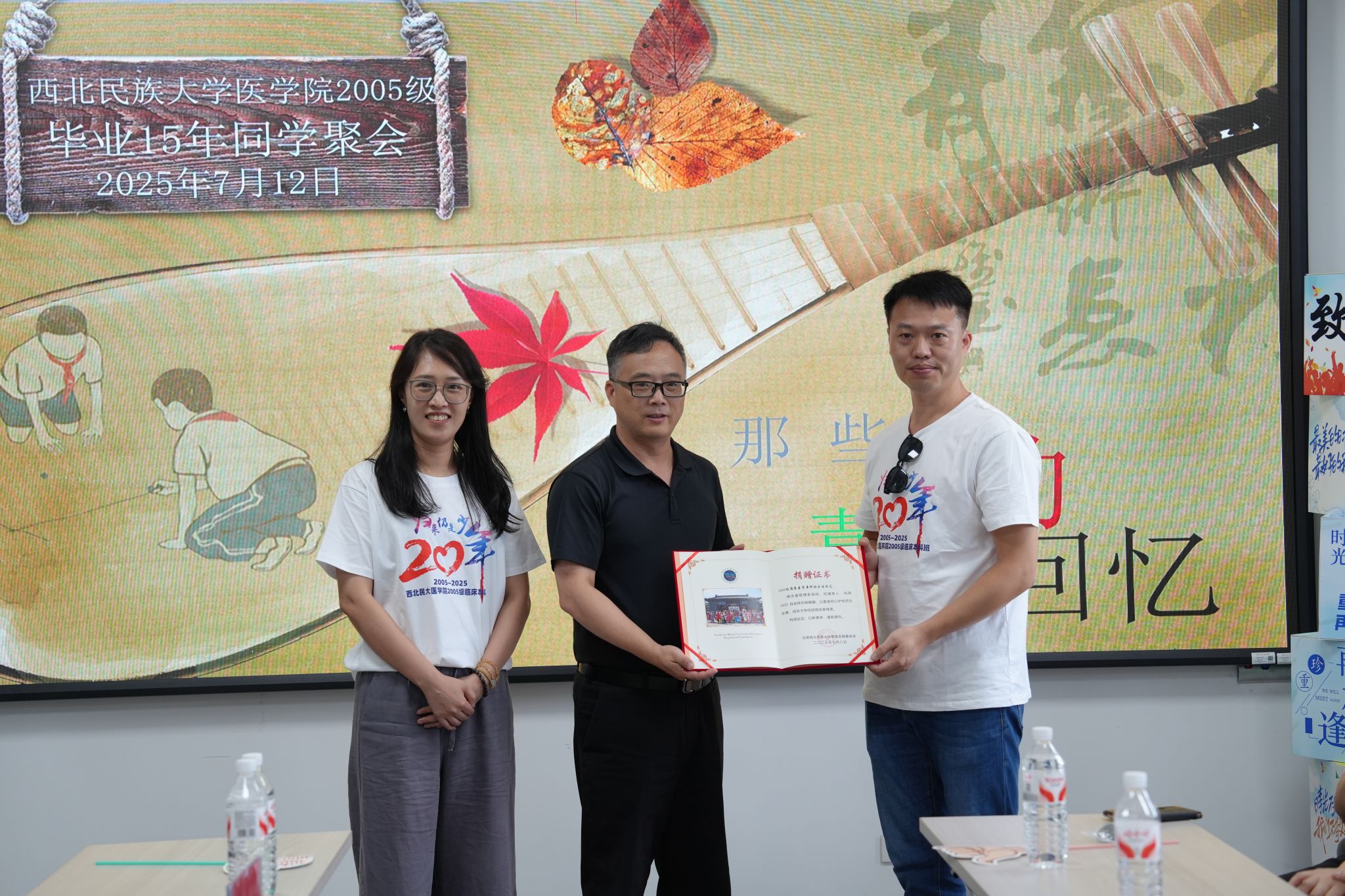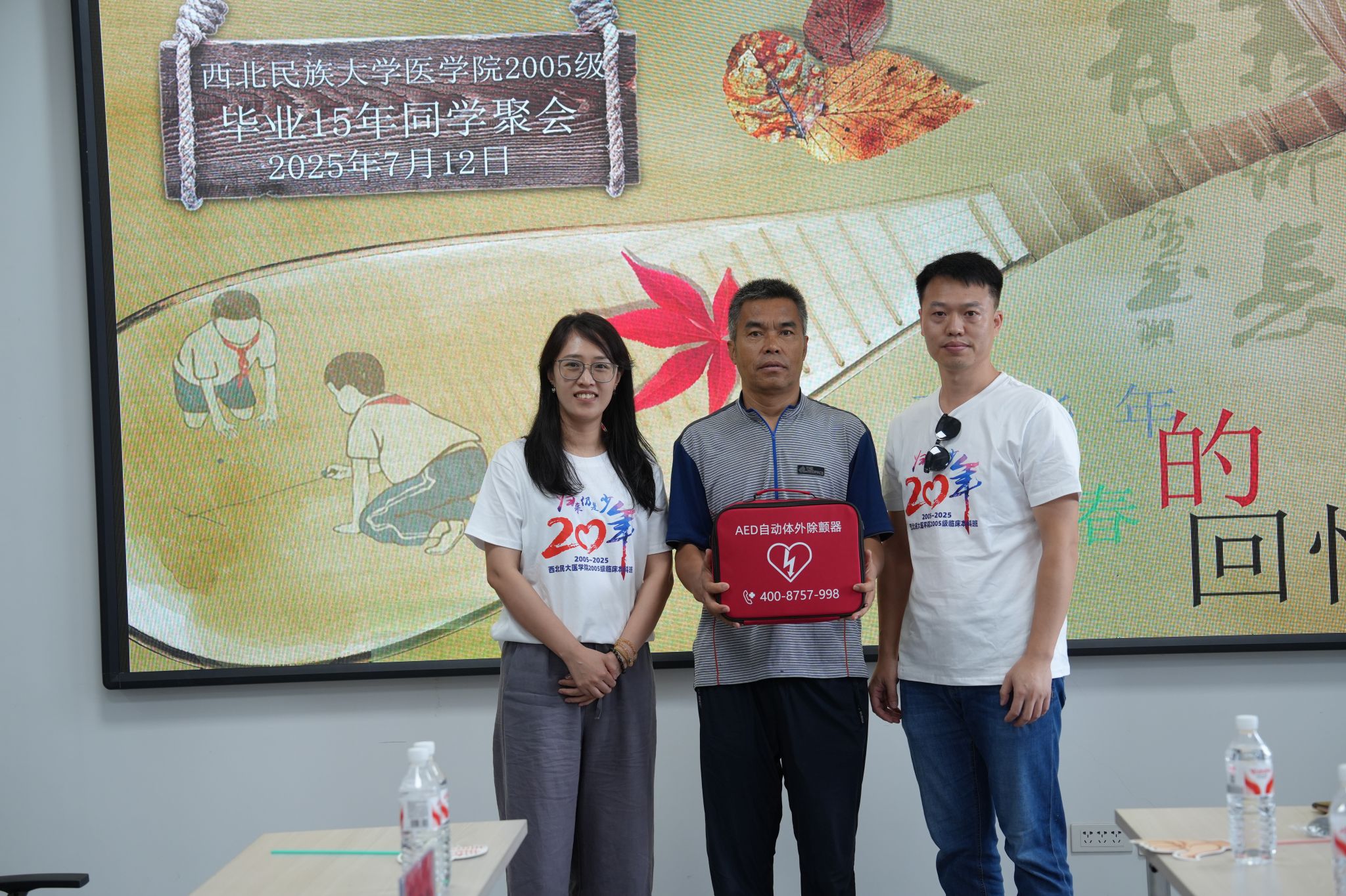 座谈会上举行了捐赠仪式,2005级临床专业校友向母校捐赠除颤仪,为临床教学和师生健康保障添砖加瓦。医学部党委副书记杜国云代表学部接受捐赠,对外联络办公室主任代表校友总会向捐赠班级颁发证书,这份爱心彰显了医者仁心的责任与担当。