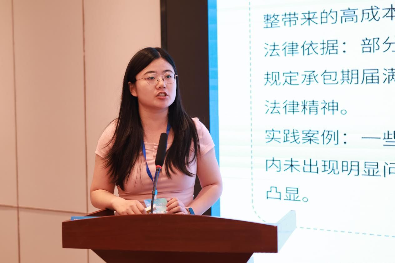 张霞硕士研究生以“农村土地新一轮承包的证成与实施”为题作主题发言,认为二轮承包不应直接延包,主张“大稳定小调整”模式,无地农民通过“流转补贴+社保兜底+就业安置”补偿,试点推行跨村调剂。