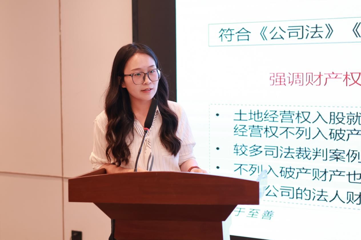 赵晨曦博士研究生以“公司破产清算中土地经营权的处置”为题作主题发言,主张公司破产时土地经营权应纳入破产财产,但需建立农户优先回购权及专项保险基金,破产清算需评估地上农作物权属。