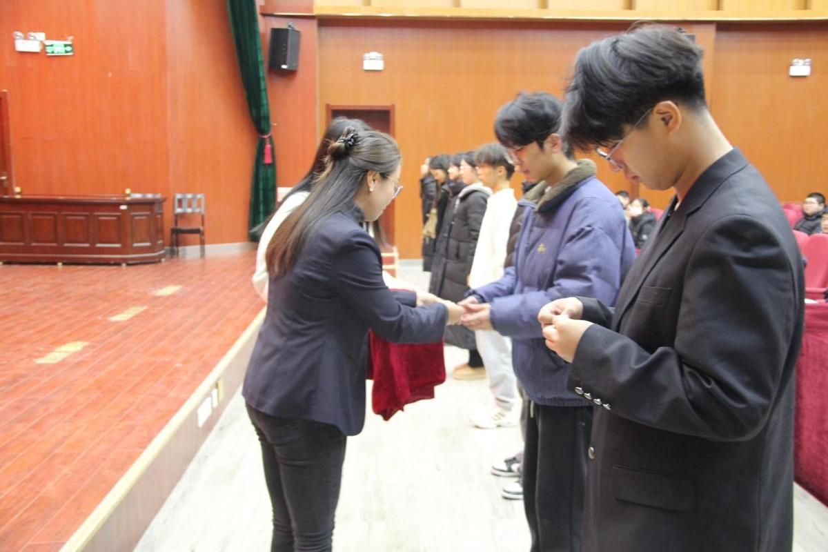 团委书记毛金莲老师为新团员代表颁授团徽。在宣誓环节,由优秀团员代表王皓同学领誓,铿锵誓言响彻现场,凝聚着对共青团的赤诚热爱和对理想信念的坚定执着。