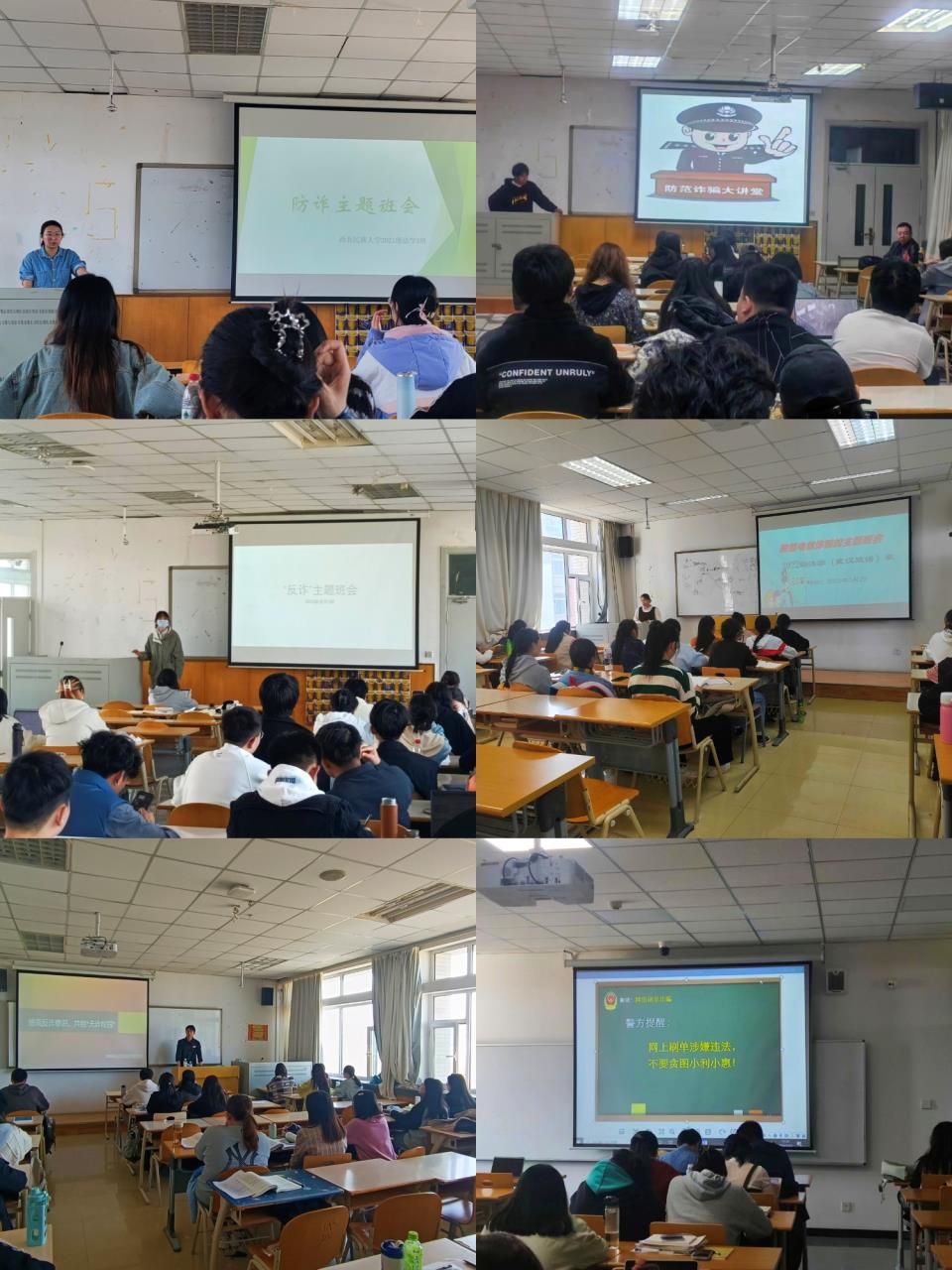 以班级为单位持续展开防诈反诈主题班会,各班级以播放视频、PPT展示和口头宣讲等方式向同学们讲解电信诈骗案例和甄别电信诈骗的方法,并重点介绍校园诈骗的类型及套路,号召全体同学勿贪小便宜,谨防上当受骗。