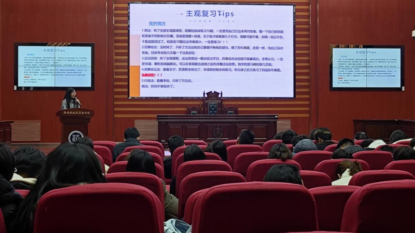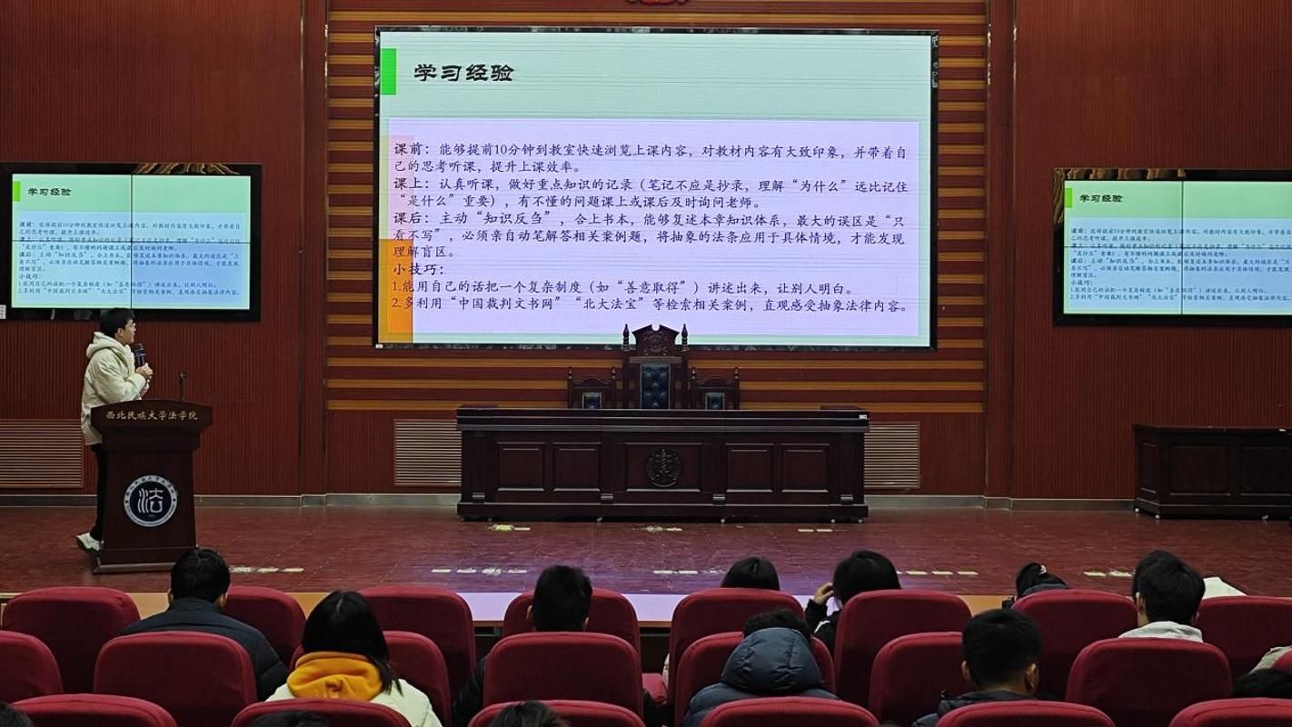 本次交流会邀请覃梦然、张子怡、丁英狄三位优秀学生代表分享心得。他们结合自身成长经历,围绕大学高效学习方法、推免核心要点、学业长远规划、备考实用方法论等关键主题,针对专业基础夯实、法律职业资格考试备战技巧、考研路径科学规划等同学们关切的内容,进行了细致深入的经验分享。