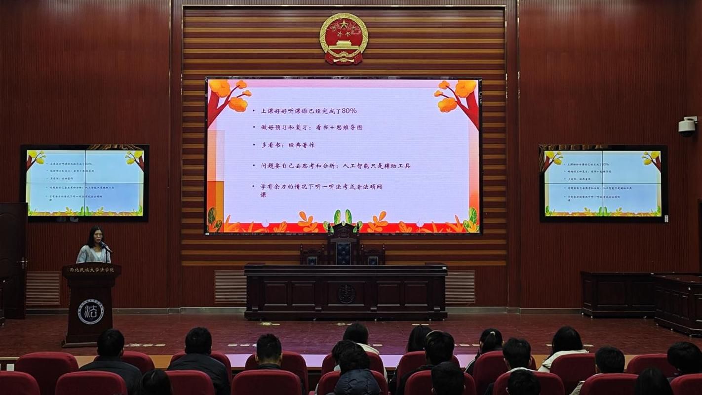 于模拟法庭成功举办法考、考研经验分享交流会。2023级全体同学参加活动,活动由孙浩圣老师主持。