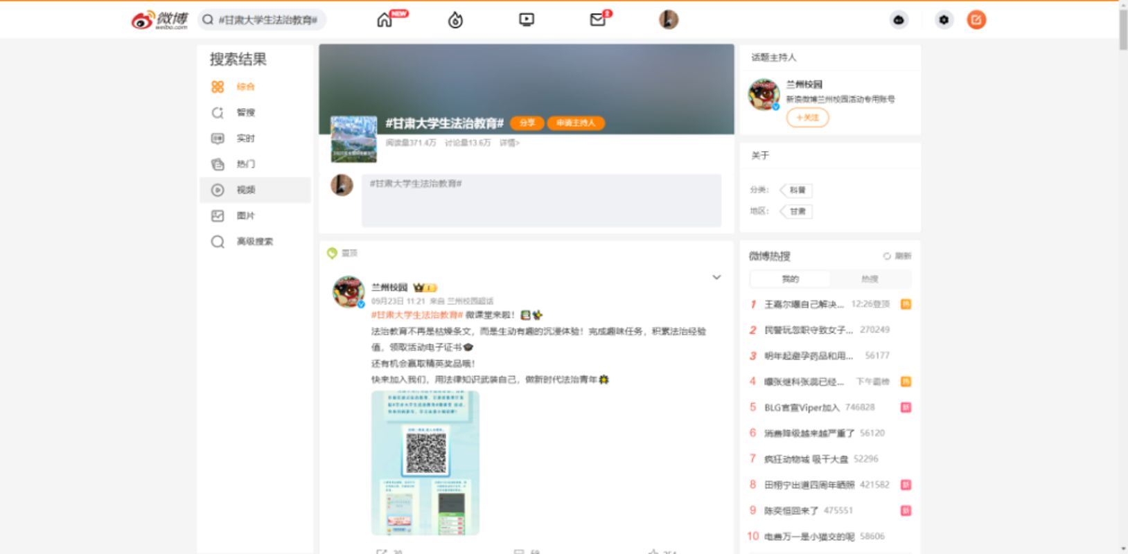 三是强化互动,让学习更“沉浸式”。在平台内嵌入“法治知识闯关”“校园普法代言人征集”“热点法治话题讨论”等互动环节,并同步开设#甘肃大学生法治教育#微博话题,鼓励大学生群体发表学习感悟、创作衍生内容。话题阅读量达371.4万,讨论热烈,形成了线上线下同频共振、学习分享相互促进的良好氛围,推动学生从“旁观者”转变为普法宣传的“参与者”和“传播者”。