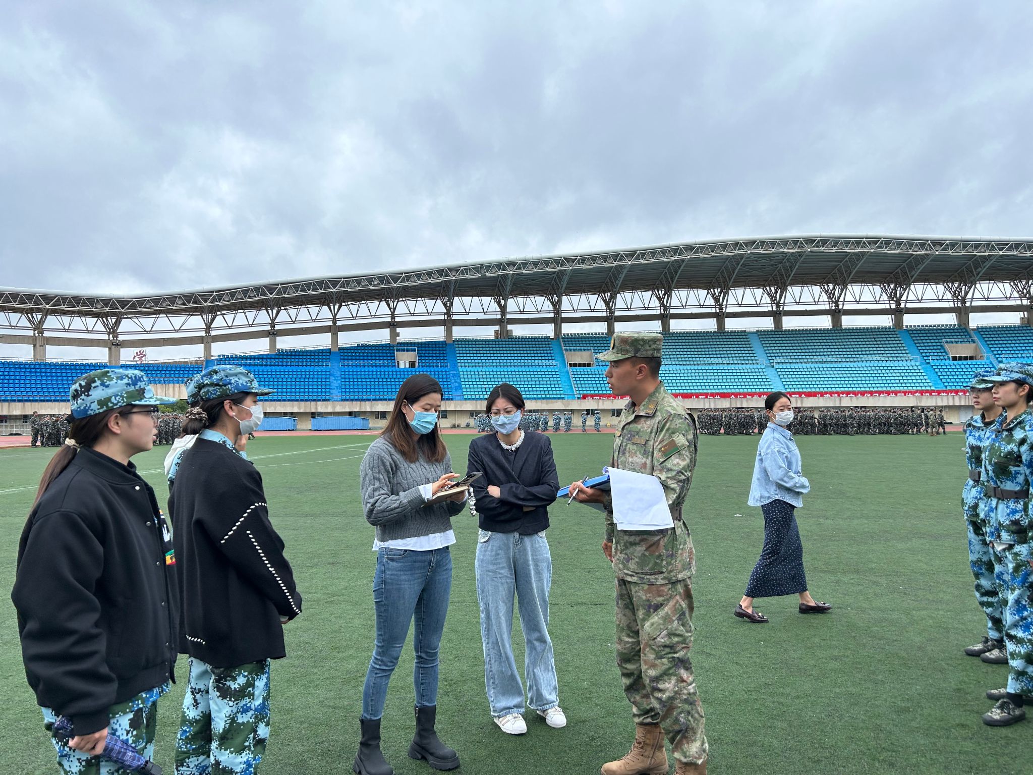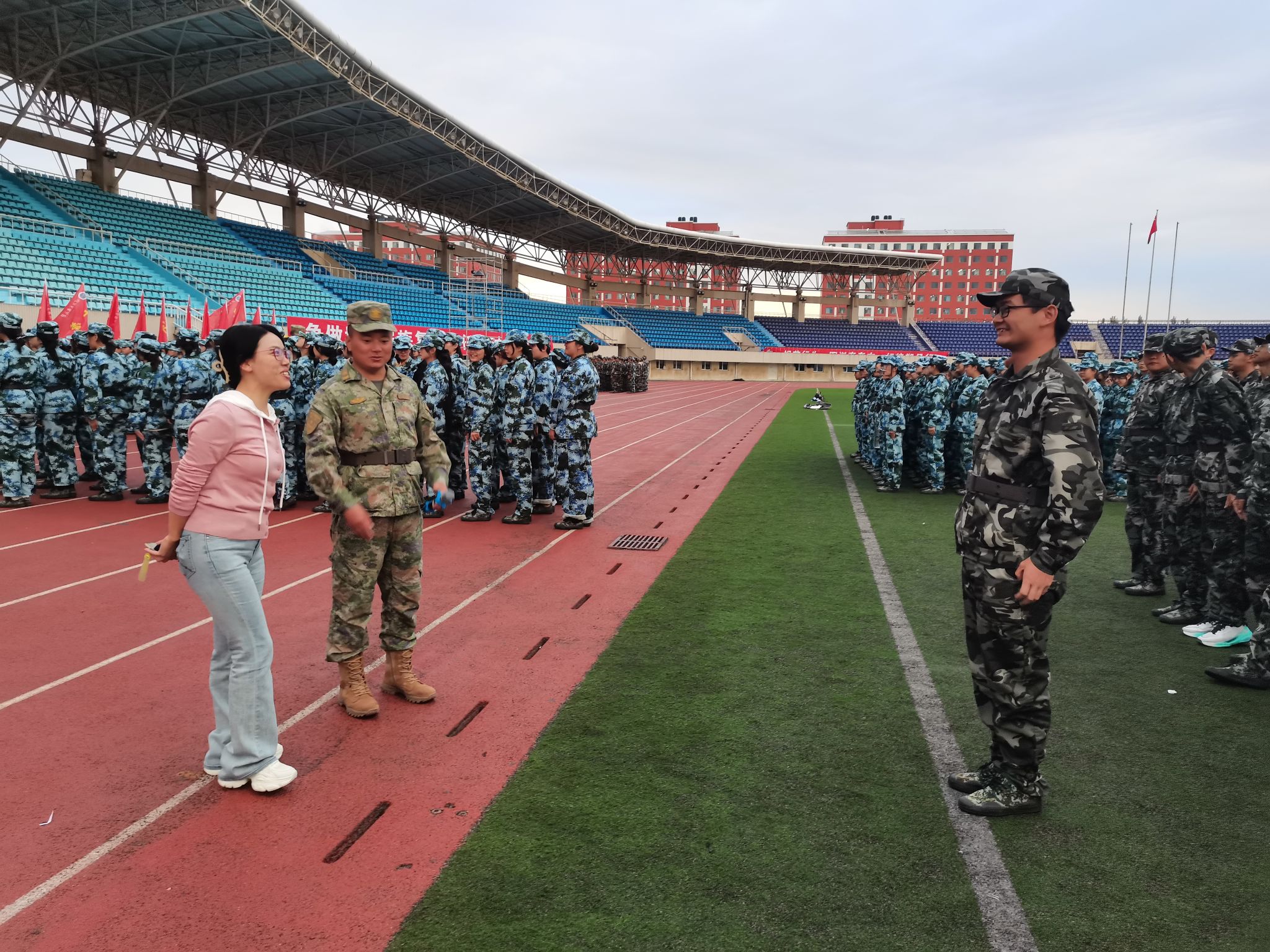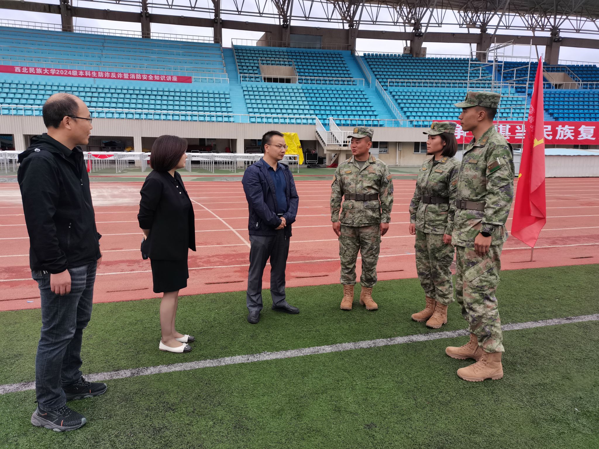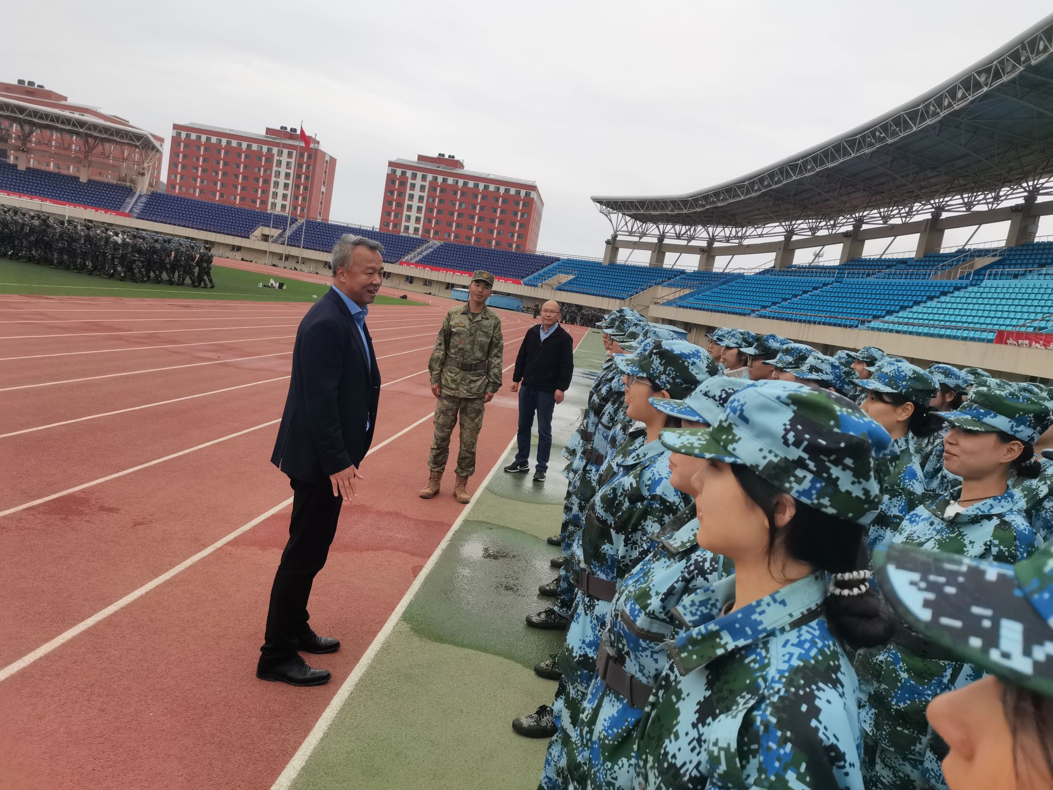 负责人向党、马明辉、米尔古丽、谢宗棠和班导师、辅导员先后走入民康田径运动场,走访看望承训部队教官和参训的2024级全体新生。
