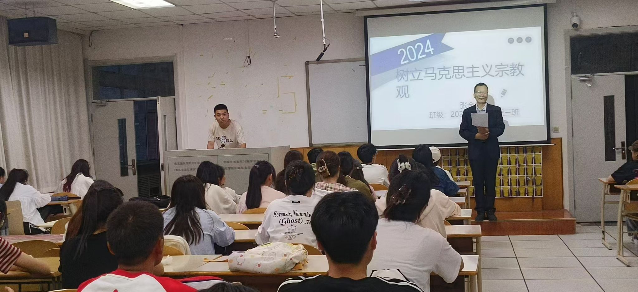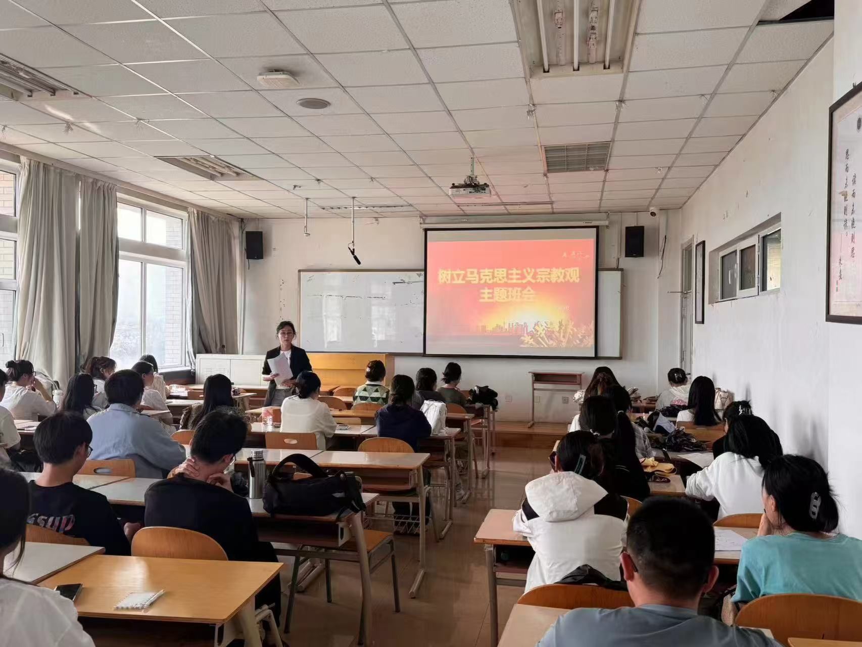 班会集体学习了习近平总书记在甘肃、陕西考察调研时的重要讲话精神,观看了《心系陇原大地——习近平总书记和甘肃的故事》《建设教育强国 习近平总书记这样部署》视频,班导师重点解读了“树立马克思主义宗教观”内容,学习领会全国宗教工作会议精神。班会引导同学们坚持教育与宗教相分离原则,严守“两个不得”“五个严禁”规定,铸牢中华民族共同体意识,努力成长为堪当民族复兴大任的时代新人。