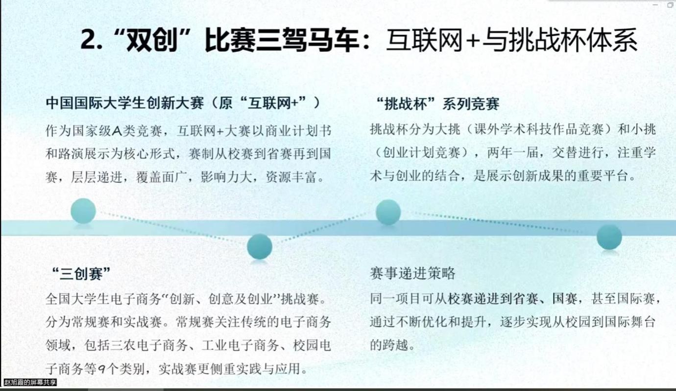 交流会上,赵旭霞首先强调大学生活的三大核心路径——卷绩点、打比赛、做实践,深度解读大学生创新创业训练计划项目、“互联网+”“挑战杯”系列竞赛、“三创赛”、学科专业竞赛等核心赛事体系,并表示竞赛不仅是展示成果的窗口,更兼顾传统与实战、创新思维与创业精神,是整合资源、提升能力的全能加速器。