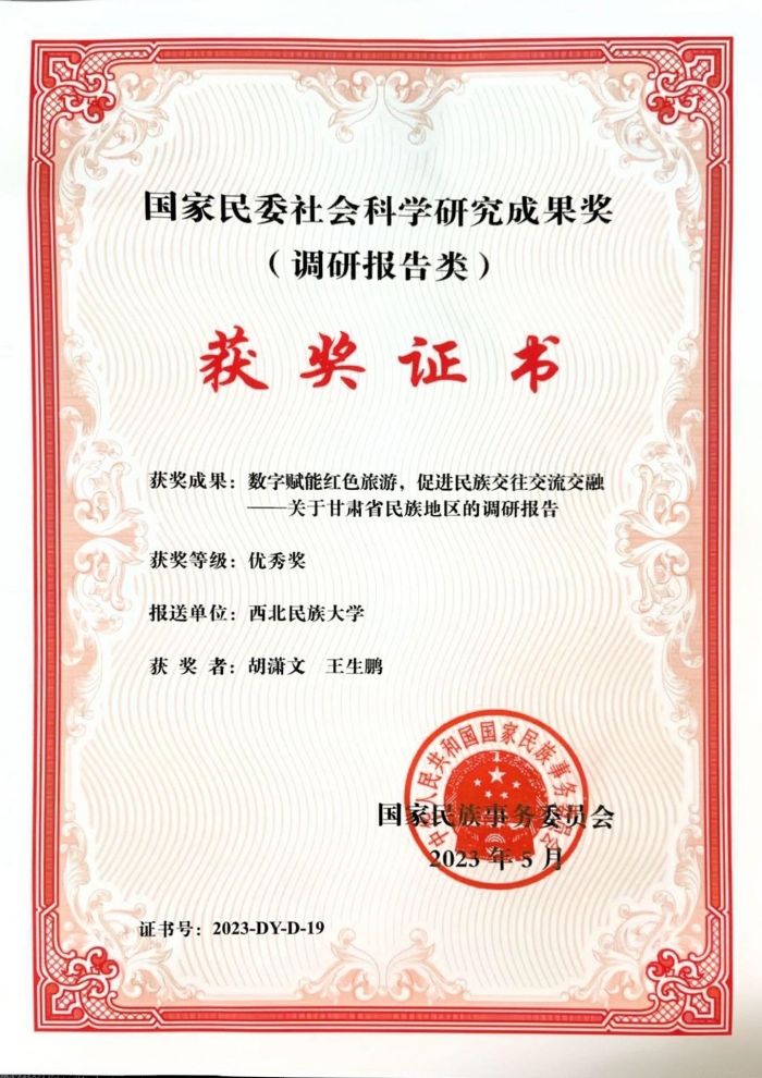 胡潇文、王生鹏两位老师撰写的调研报告《数字赋能红色旅游,促进民族交往交流交融——关于甘肃省民族地区的调研报告》(以下简称“《调研报告》”)荣获国家民委社会科学研究成果奖(调研报告类)优秀奖。