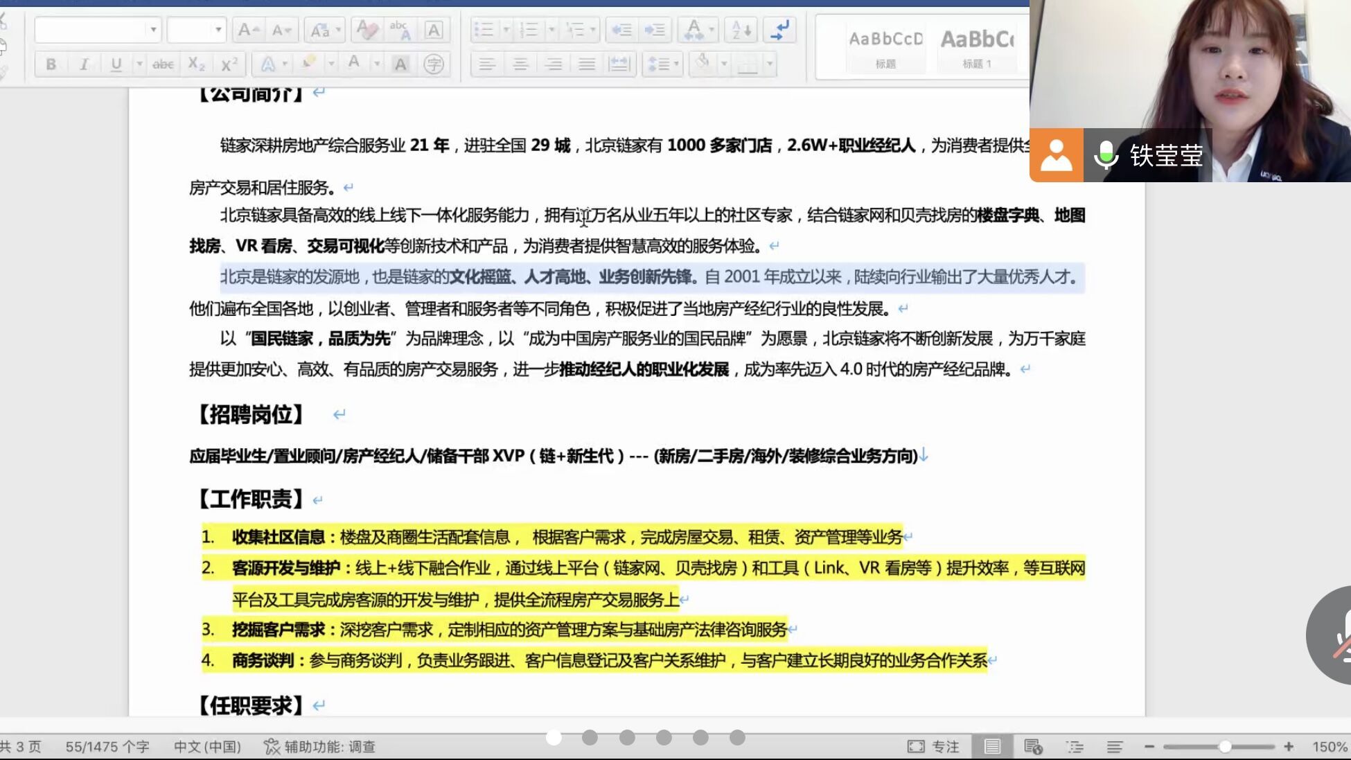 铁莹莹同学现供职于北京链家房地产公司,宣讲会上,她向与会学生讲述了自己毕业后求职择业以及二战考研的经历和感想,突出了职业发展中“目标”的重要性,无论是考研还是找工作,首先要考量的一个问题就是自己的需求和目标。同时,铁莹莹同学还向参会学生介绍了自己供职单位北京链家的基本情况,包括工作环境、工资待遇、发展前景等,并向有意向应聘的学生提供了线上应聘和投递简历的通道,重点介绍了单位内推的情况和程序。与会学生积极参与互动,毕业生向铁莹莹同学咨询了工作地点、应聘和面试等问题。