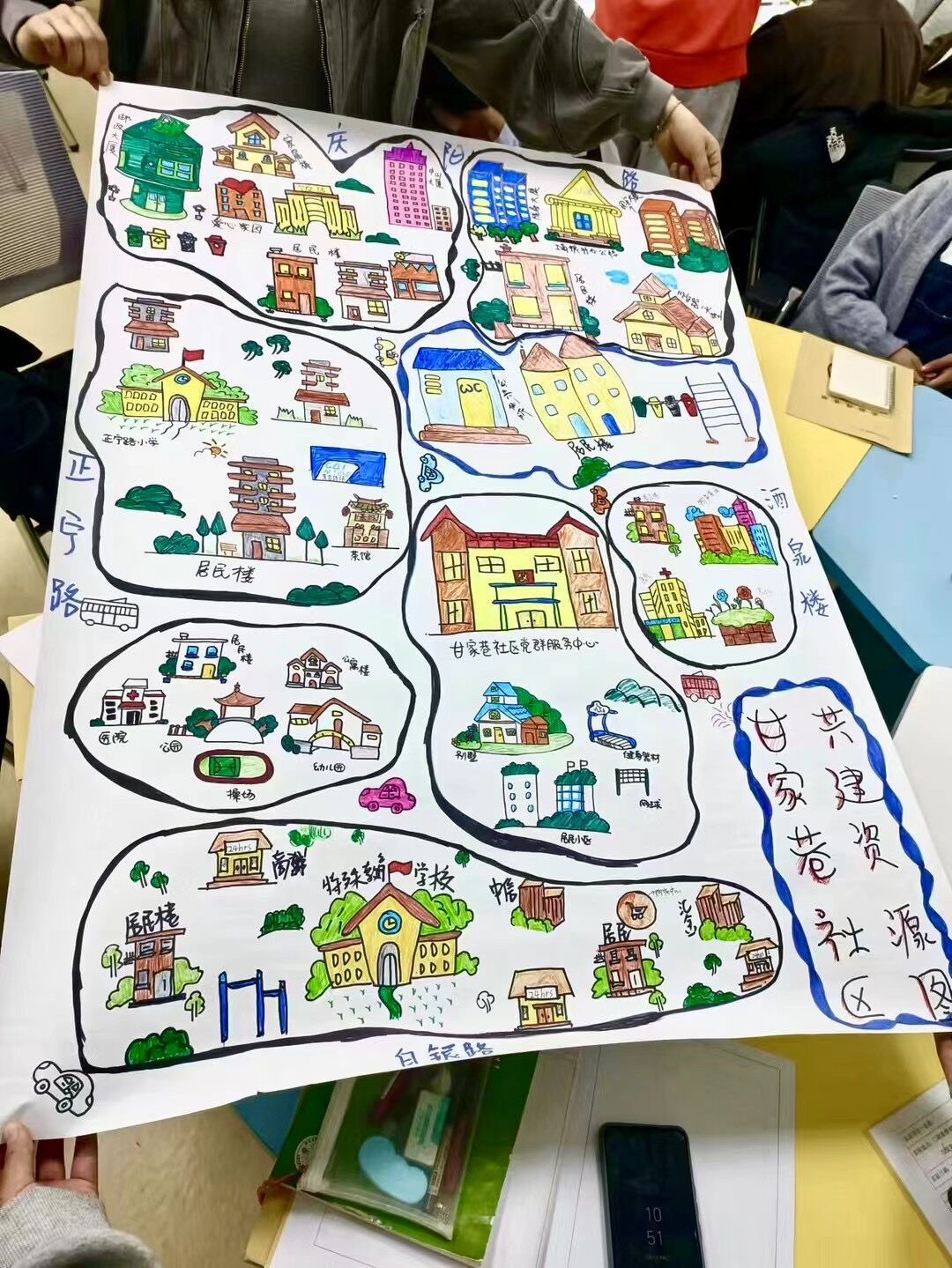 在参与调研的过程中,唐梅鼓励学生以实地参观走访的方式,对社区现有资源进行观察和记录,包括社区的公共空间、组织、宣传场景、人文、交通及相关产业等,并与辖区居民进行沟通了解,梳理社区资源情况。结合社区网格化管理服务示意图,绘制出甘家巷社区的社区资源地图。唐老师与学生们一起参观,耐心解答学生们提出的问题,引导学生们将课堂所学的理论知识运用到实务中去。