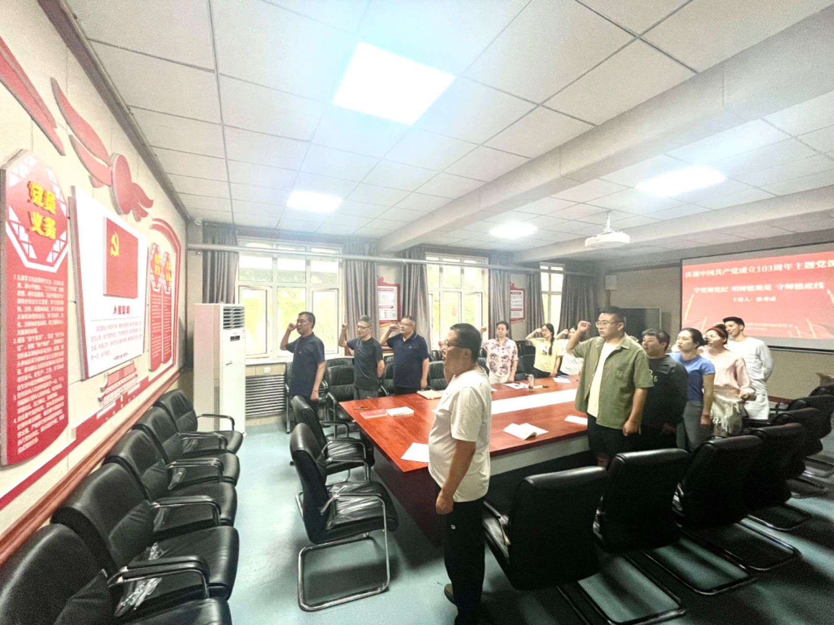 103年砥砺拼搏,103年奋楫前行。每一寸土地都积蓄着向上的力量,每一帧画面都充溢着向前的豪情。全体党员面对党旗、举起右拳,重温入党誓词,再次表达为党的事业奋斗终身的决心。