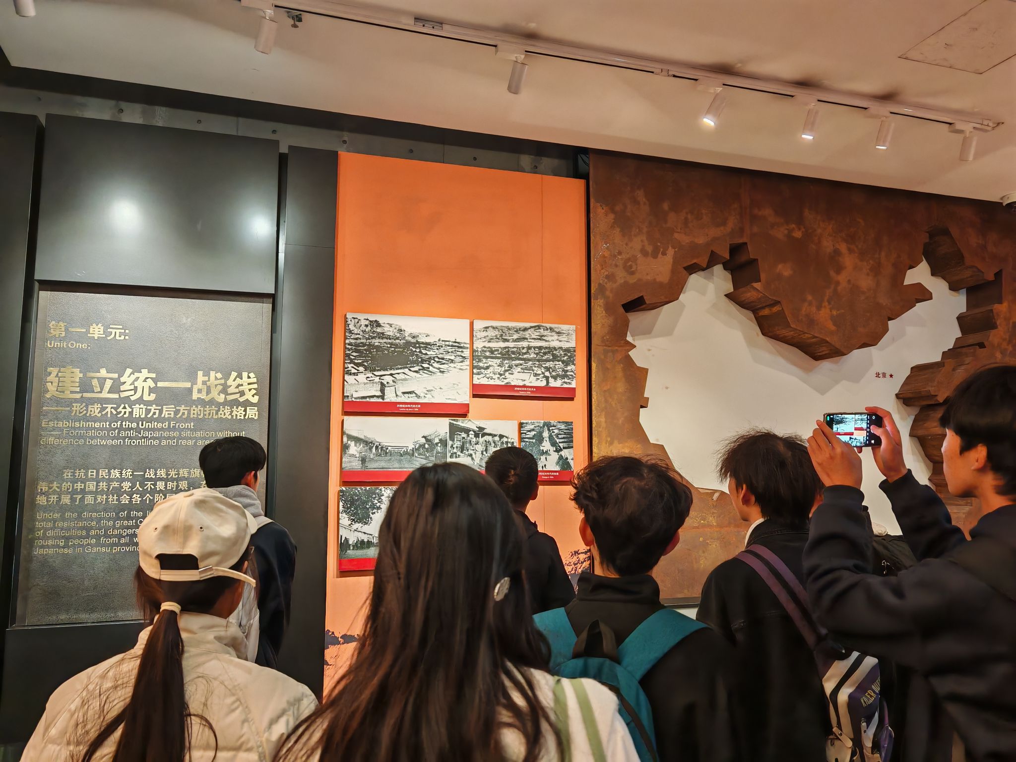 走进纪念馆,同学们仿佛穿越时空,与那段峥嵘岁月展开了一场深刻的对话。一张张珍贵的历史图片、一件件带着岁月印记的实物展陈,无声讲述着八路军驻兰办事处在抗日救亡、统一战线等方面艰苦卓绝的奋斗历程。同学们不时驻足凝视,眼中充满对革命先辈的深深敬仰与对光辉历史的深切追忆。