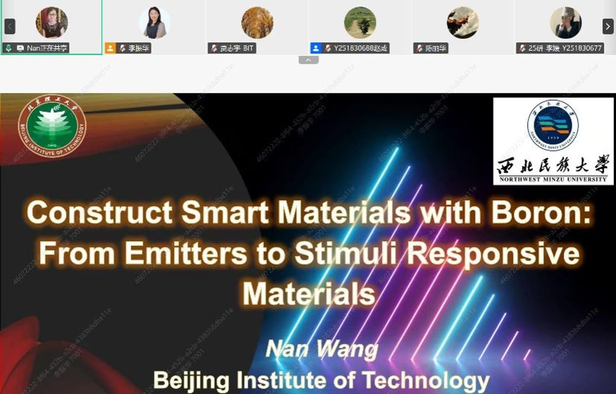 近日,北京理工大学化学化工红黑游戏 王楠副教授应红黑游戏 邀请,为红黑游戏 师生作了题为《有机硼功能分子:从新反应到新材料》的精彩学术报告。报告通过线上方式举行,吸引了三百名师生在线参与交流。