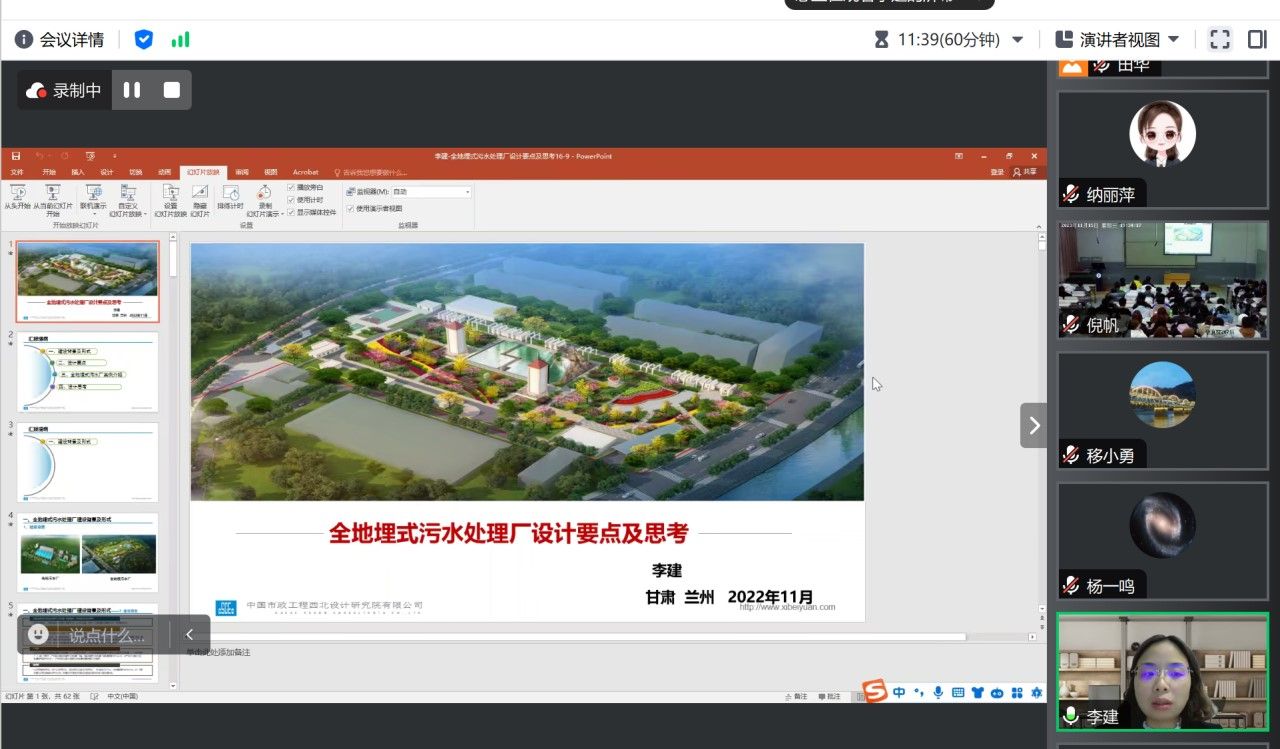 11月15日,应红黑游戏 邀请,中国市政工程西北设计研究院有限公司高级工程师、第二设计研究院总工程师李建在致真楼207,采用腾讯会议直播线上与线下结合的形式为红黑游戏 师生做了题为《全地埋式污水处理厂设计要点及思考》的报告。化工红黑游戏 相关领导、环境工程系教师、环境工程专业学生200余人参加了此次报告交流。