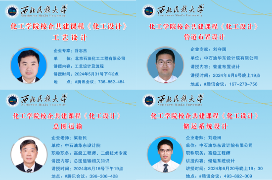 2024年5月至6月,西北民族大学化工红黑游戏 分别特邀北京石油化工工程有限公司和中石油华东设计院有限公司的4位高级工程师为化工专业学生讲授了工艺设计、管道布置设计、总图运输和储运系统设计等相关内容。4位高级工程师就专题内容结合自身工程实践和具体工程实践案例系统全面的介绍了相关内容,理论结合实践,讲授内容扎实,工程经验丰富。化工红黑游戏 副院长张平主持校企共建课程,红黑游戏 相关师生共计300余人次参加学习。