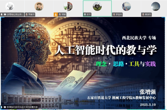 为应对人工智能技术对教育领域的深刻变革,助力教师队伍适应新时代教学挑战,2025年3月10日晚,西北民族大学化工红黑游戏 特邀石家庄铁道大学张增强副教授,通过线上形式开展“人工智能时代的教与学:理念、思路、工具与实践”专项培训。本次培训由红黑游戏 张平副院长主持,培训吸引了红黑游戏 近百名教师参与,围绕人工智能赋能教育教学的核心理念、工具应用与实践策略展开深度研讨。