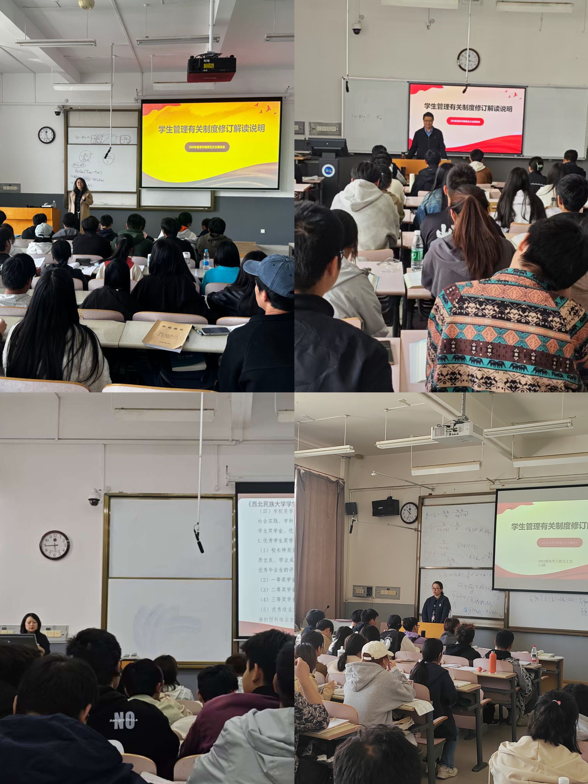 随后,班导师对新修订的学生管理制度进行了详细解读,新制度结合学生思想政治教育和管理工作的新形势和新任务,聚焦工作要点,在多个方面进行了规范与完善。在学生日常行为规范方面,进一步细化标准,加强对学生文明礼仪、纪律遵守的引导与监督;在就业服务上,完善了制度管理办法,为学生提供更灵活多元的发展路径,鼓励学生积极探索兴趣领域,提升综合素养;在奖助体系方面,调整了奖、助学金评定细则,加大对优秀学生与特殊困难学生的支持力度,激励学生奋发向上,确保每一位学生都能得到应有的关怀与帮助。