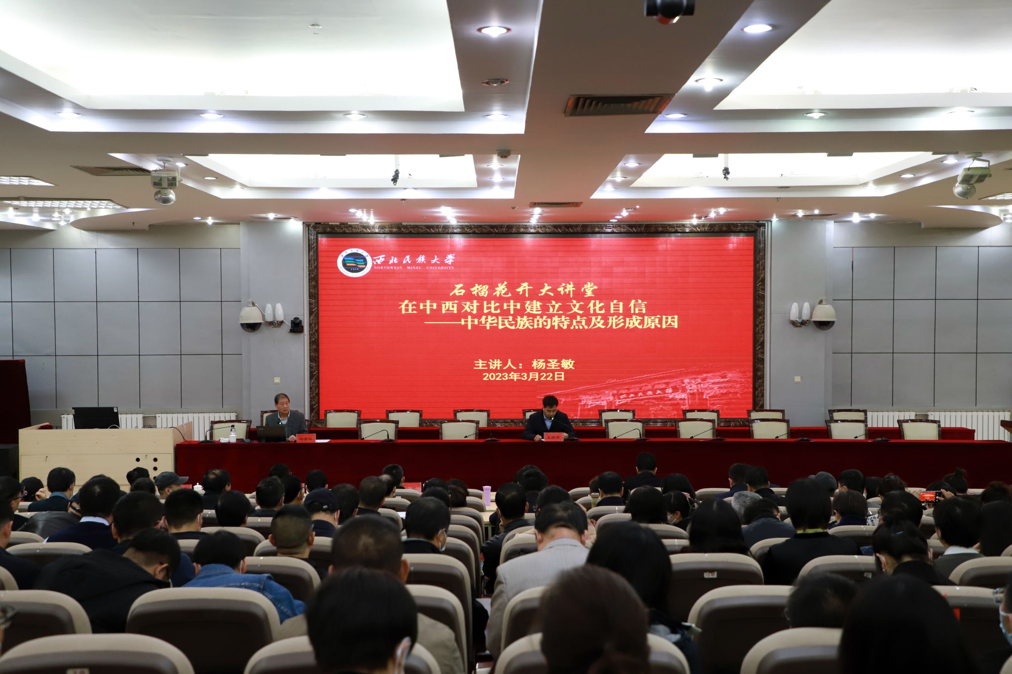 “石榴花开大讲堂”系列讲座在文津楼学术报告厅举办。中央民族大学资深教授、教育部人文社会科学重点研究基地中国少数民族研究中心学术委员会主任杨圣敏应邀宣讲。校党委常委、副校长马世俊主持讲座。在家校领导,师生、党员干部、民主党派、党外知识分子和附属中学教师代表350余人参加。