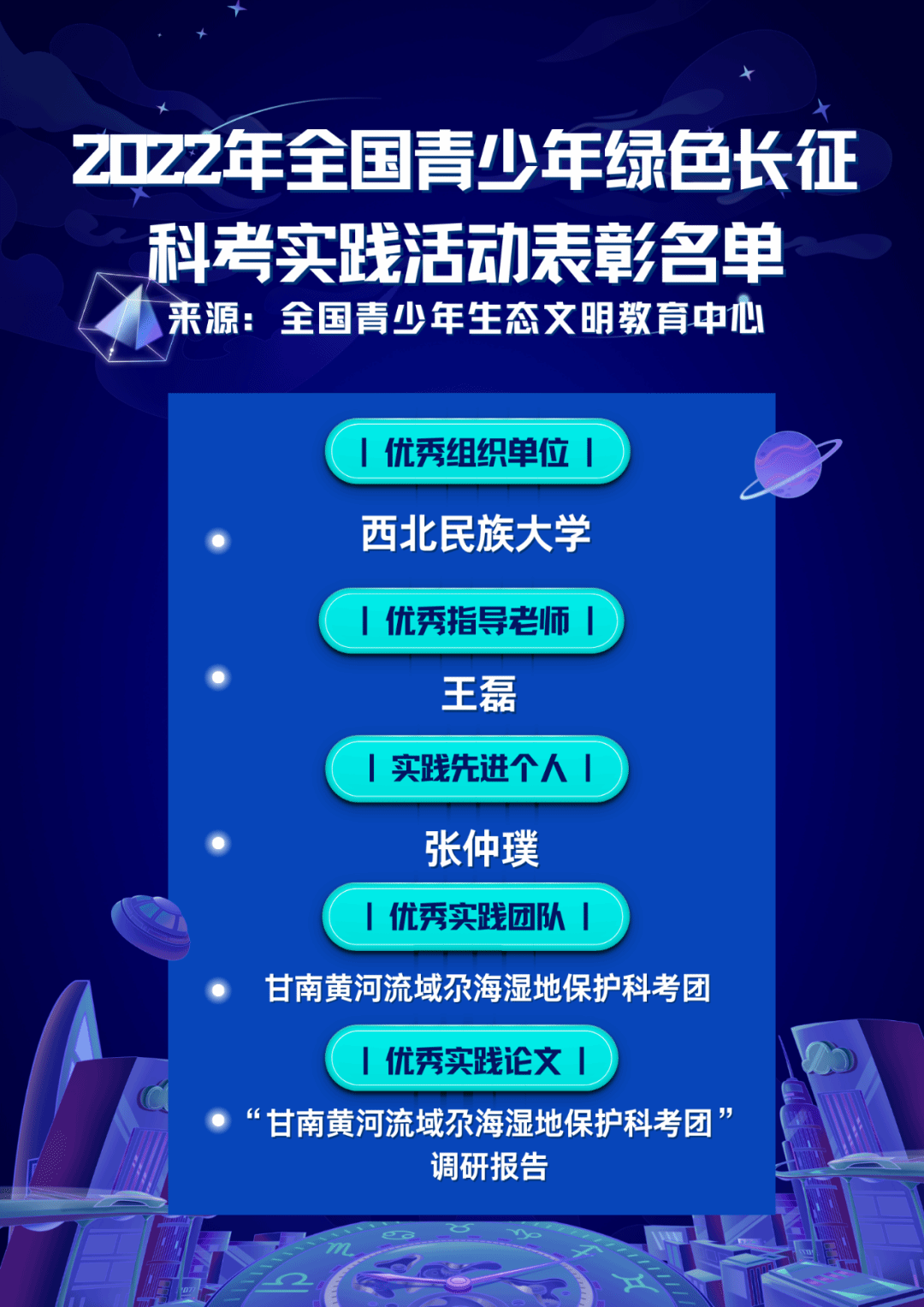 本科生张仲璞获“实践先进个人”,甘南黄河流域尕海湿地保护科考团调研报告获“优秀实践论文”,实践团队获“优秀实践团队”。