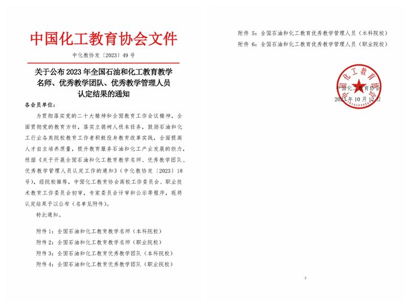 10月12日,中国化工教育协会公布了2023年全国石油和化工教育教学名师、优秀教学团队、优秀教学管理人员认定名单,红黑游戏 化工红黑游戏 苏琼教授获得“全国石油和化工教育教学名师”荣誉称号。