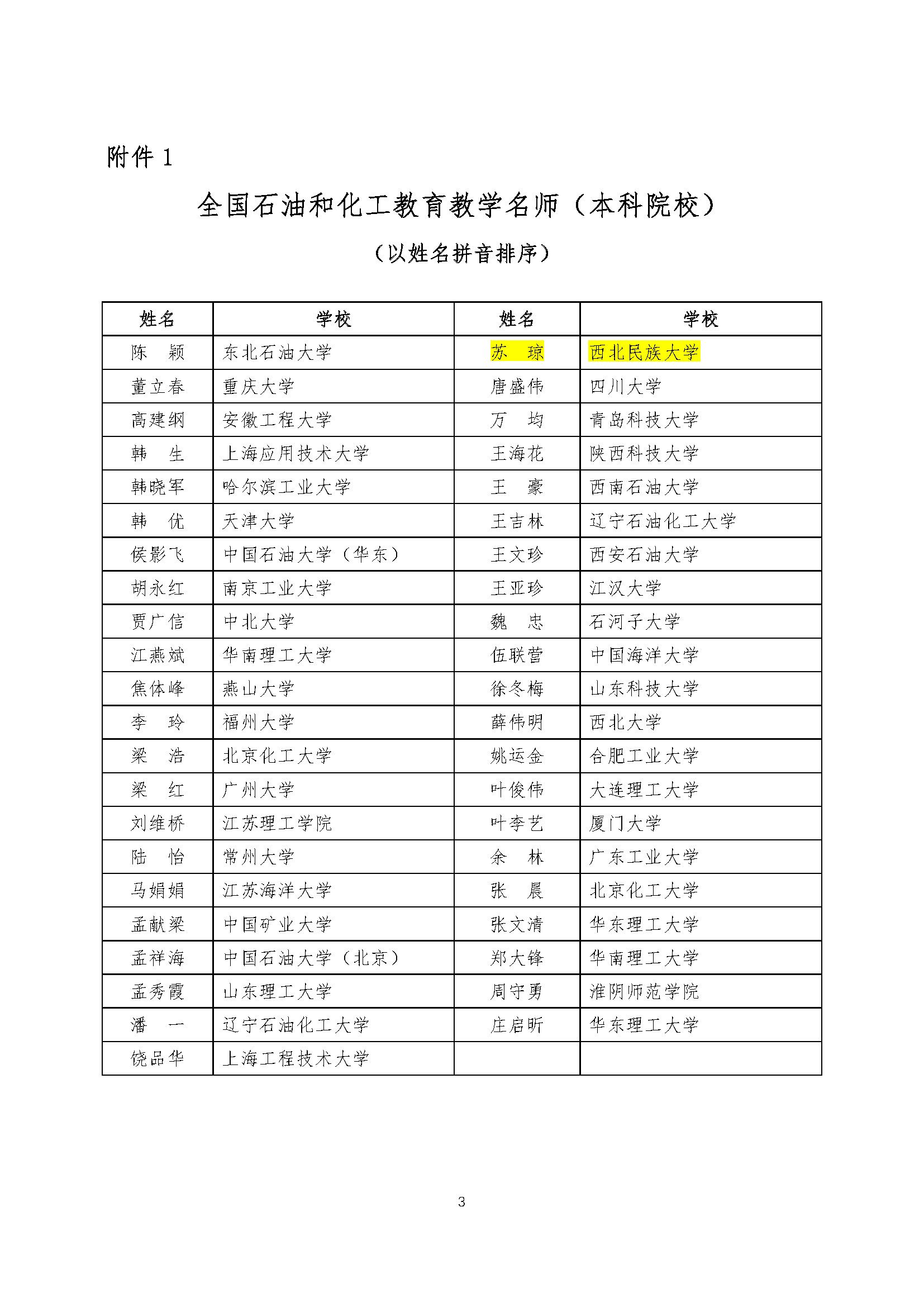 “全国石油和化工教育教学名师”的评选旨在表彰对我国石油和化工教育事业发展做出突出贡献、教学理念先进、实践经验丰富的一线教师,鼓励广大教师不断增强教书育人责任感和使命感,积极投身教育教学改革,提高人才培养质量,更好地服务石油和化学工业高质量发展。