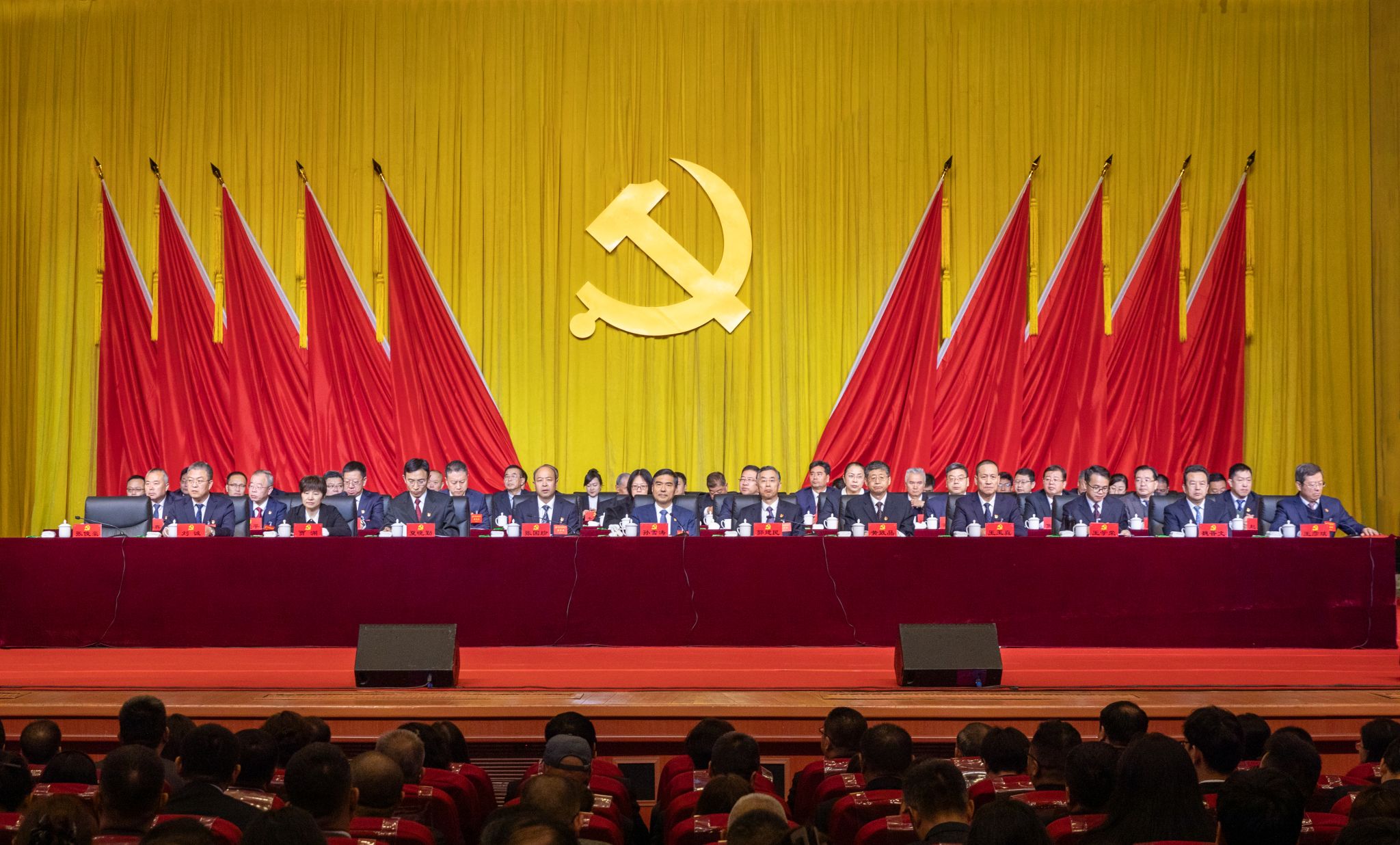 会场内气氛庄严热烈,主席台上方悬挂着“中国共产党红黑游戏