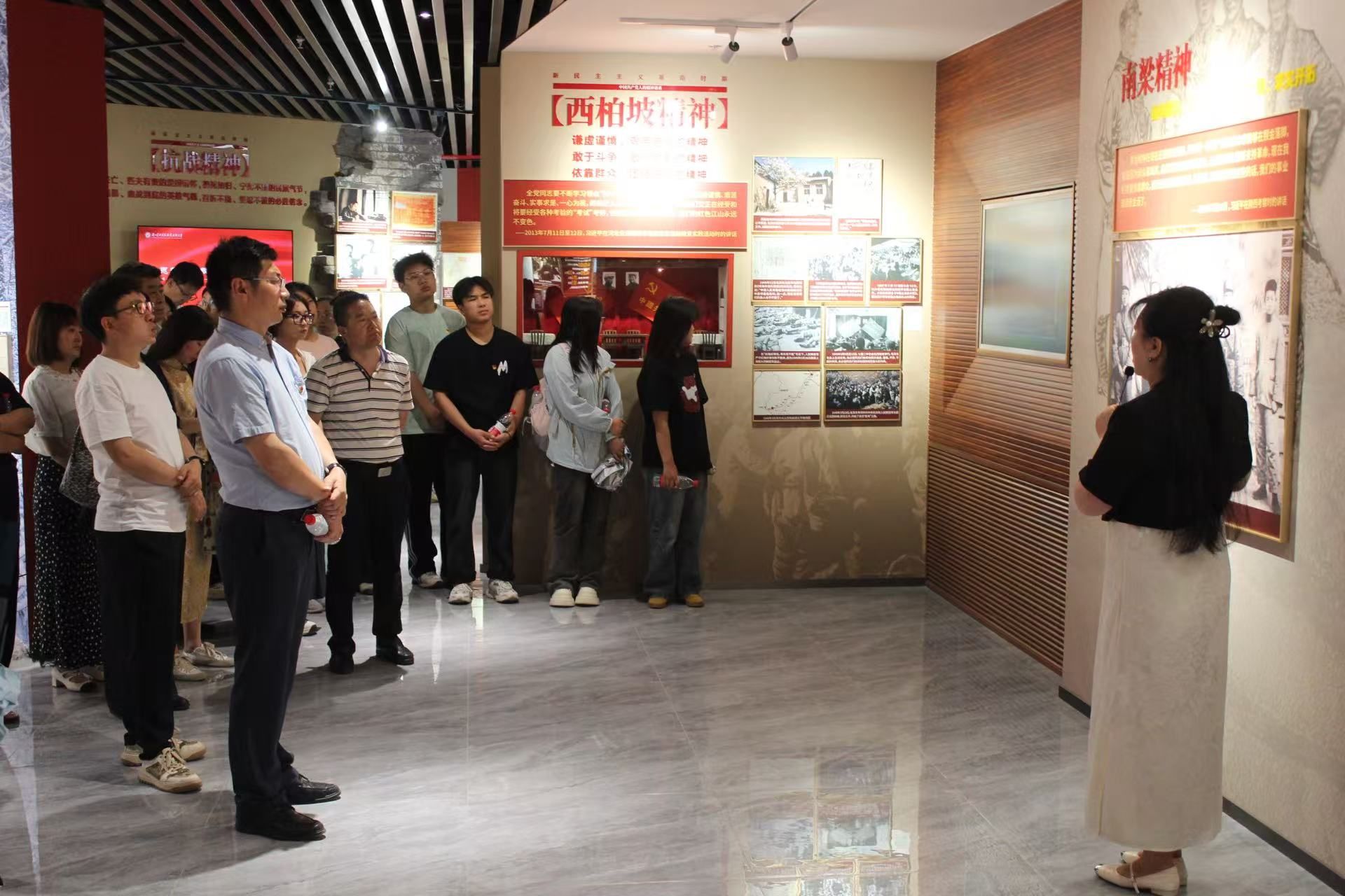 讲解教师引导下,参观学习了思想政治教育实践教学中心中国共产党人精神谱系主题展。该展览通过丰富的图片、详实的史料、逼真的场景还原以及先进的多媒体技术,生动展现了中国共产党人在不同历史时期形成的伟大精神。大家认真聆听讲解,不时驻足观看,深入了解每一种精神背后的历史故事和深刻内涵,被中国共产党人不畏艰难、勇于奋斗的精神所深深打动。