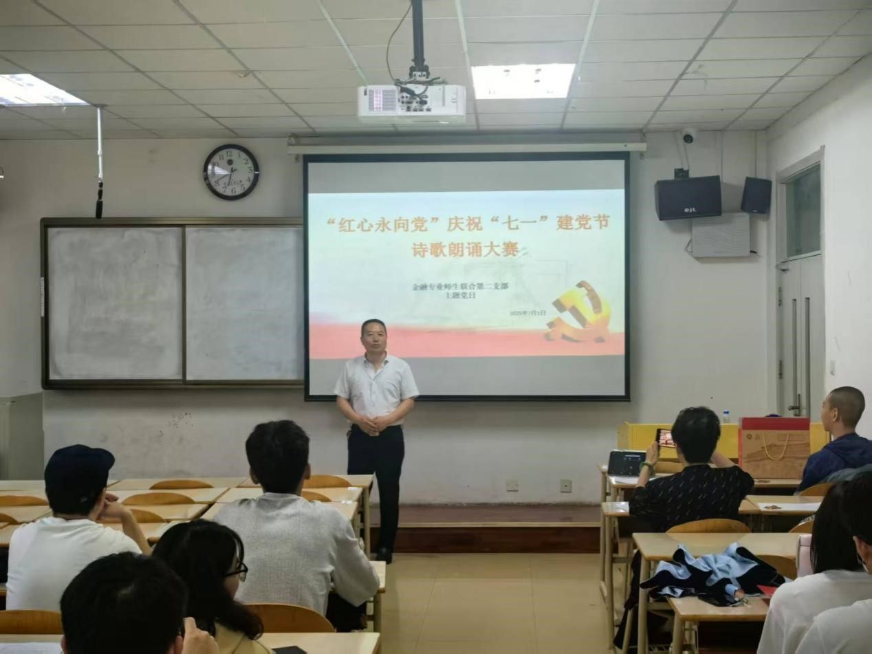金融专业师生联合第二党支部7月1日晚在致善楼举办了“红心永向党”庆祝“七一”建党节主题党日活动。活动以诗为媒,以声传情,在党的生日到来之际献上了一份饱含深情的文化贺礼。