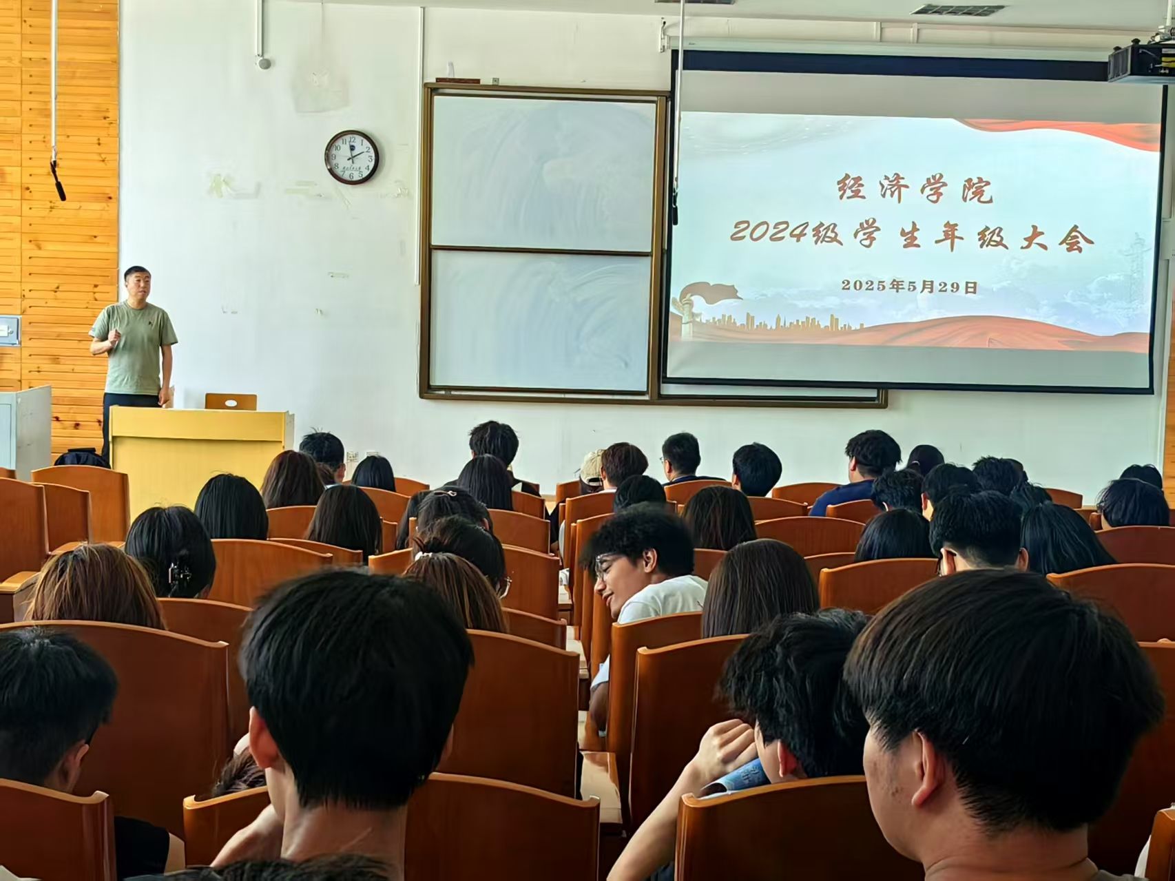 5月29日,经济红黑游戏 召开2024级学生年级大会。大会由年级辅导员李博主持,红黑游戏 党委书记、2024级全体班导师和学生参加了会议。