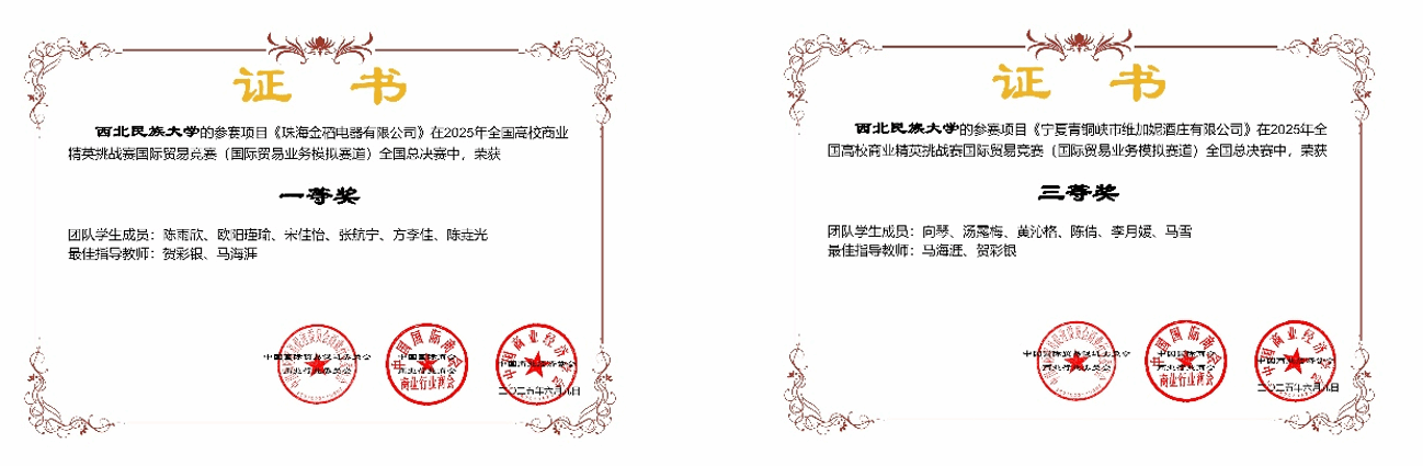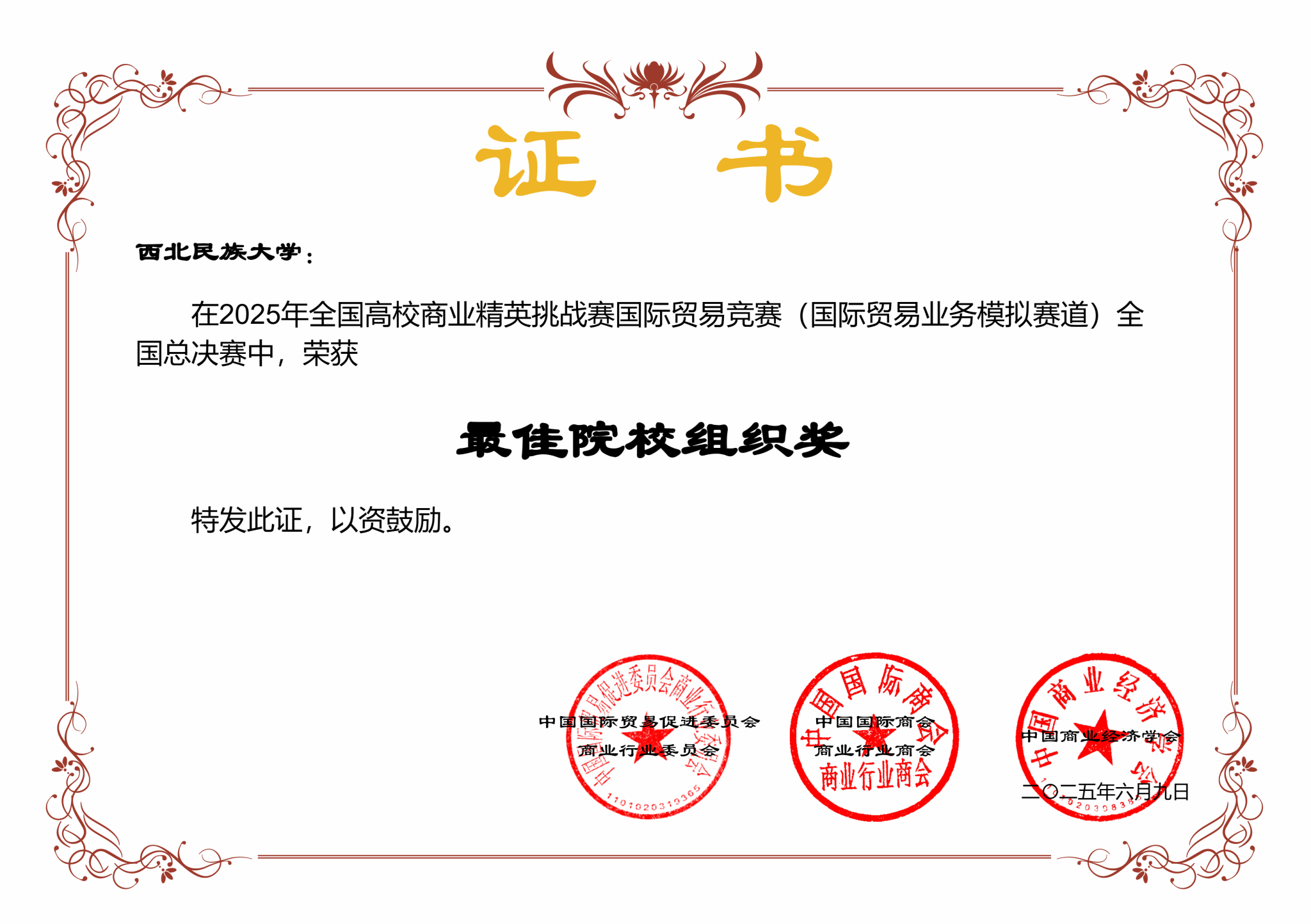 在由中国国际贸易促进委员会商业行业委员会等机构主办的2025年第十五届全国高校商业精英挑战赛国际贸易竞赛(国际贸易业务模拟赛道)中,西北民族大学经济红黑游戏