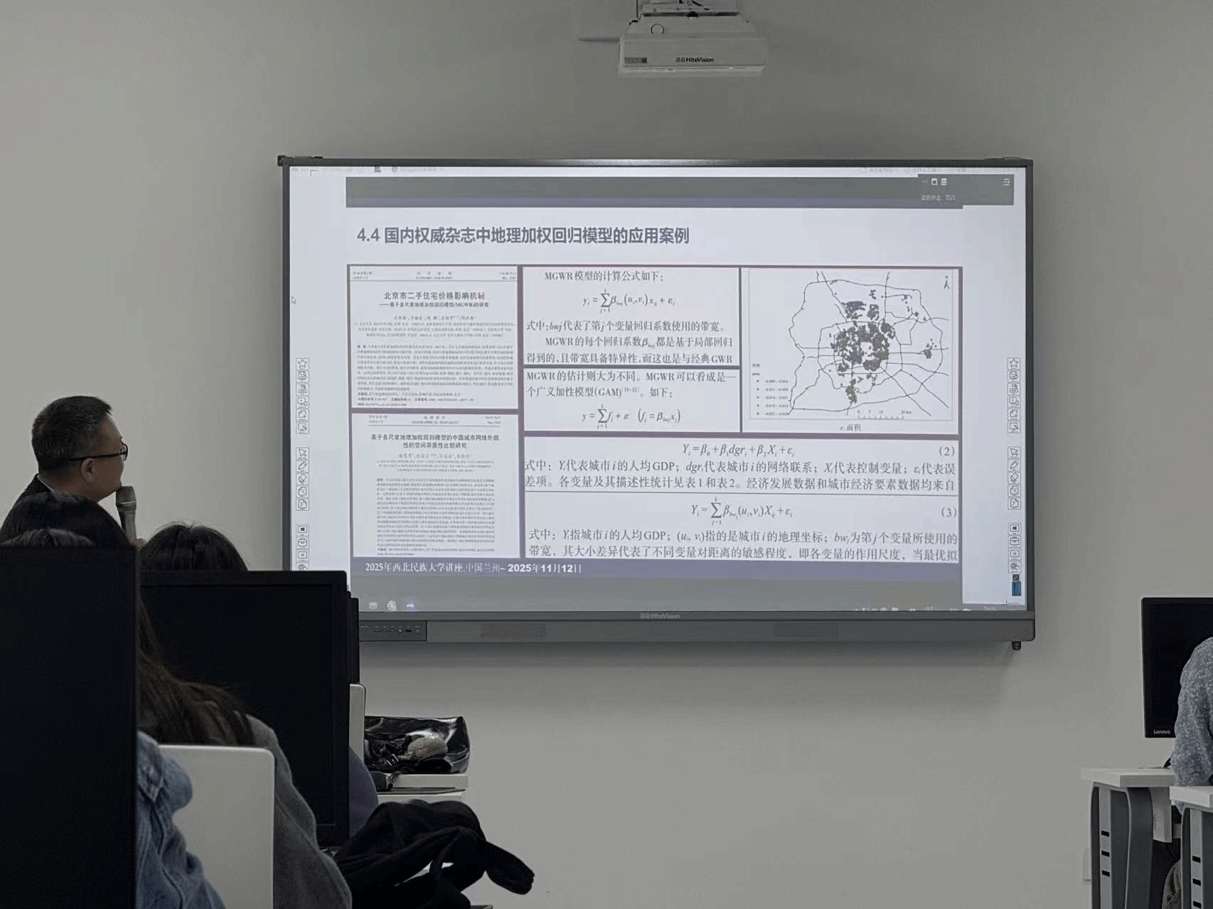 在讲解空间计量模型时,范巧教授指出,传统计量模型通常假设样本之间相互独立,但在区域经济、地理环境等研究中,个体之间往往存在空间依赖性。空间计量模型正是为了捕捉这种空间关联而发展起来的前沿方法。结合中国城市经济发展数据,展示了如何通过空间权重矩阵刻画地区之间的经济互动与溢出效应。为进一步探讨变量关系的空间非平稳性,范巧教授引入了地理加权回归模型(GWR)。与传统全局回归模型不同,GWR允许回归系数随地理位置变化,从而更灵活地反映变量关系的局部特征。他通过讲解“基于多尺度地理加权回归模型的中国城市网络外部性的空间异质性比较研究”案例,使同学们对地理加权回归模型有了更切实的了解,能够有效帮助同学们在实证分析中做出更深入的研究。