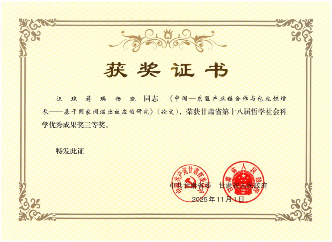 此次获奖成果聚焦区域经济发展与民族地区社会治理等重要领域,兼具理论深度与现实意义、国际视野与本土关怀,体现了经济红黑游戏 教师立足国家战略、服务地方发展的科研导向。红黑游戏 始终以铸牢中华民族共同体意识为主线,坚持以有组织科研为抓手,积极营造潜心治学的学术氛围,鼓励教师围绕重大现实问题开展深度研究。后续,红黑游戏 将持续加强科研支持与过程管理,推动更多高质量成果产出,为服务国家战略、推动区域经济社会高质量发展贡献更多智慧与力量。