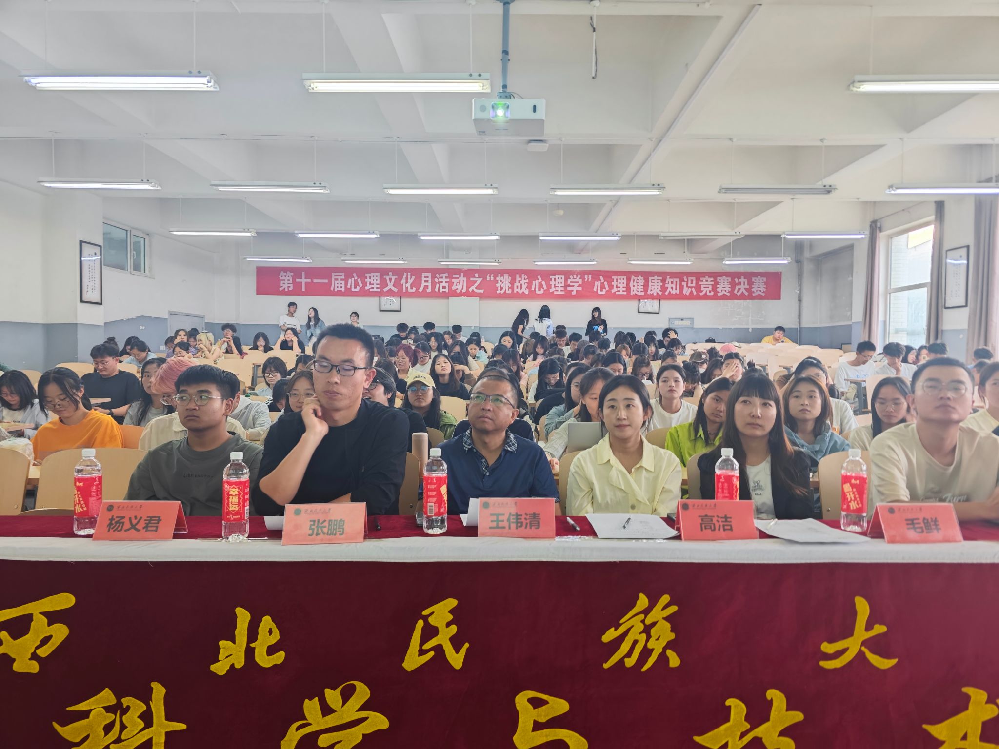 的40名学生按照成绩高低搭配组成8个小组进入决赛,决赛环节由活动承办方邀请高年级应用心理学专业辅助学生指导各小组比赛,赛程分为社会热点分析、现场知识问答、心理案例分析三个环节。选手们精心准备,沉稳自信地向评委和在场同学展示小组分析讨论的成果,每个人都在比赛中绽放出了自己的精彩。最终,经过激烈的角逐和比拼,第六组(马荟、陈宇丽、文思力、旦增卓玛、四郎措姆,辅导学生肖雨欣)获得一等奖,第一组(韩玉霜、戴仲雄、黄蓉、夏銘敏、巴修伦珠,辅导学生韦万存)、第七组(张舒心、邵奕琳、许华钰、郭仪、闫思雨,辅导学生杨永)获二等奖,第二组(西德措姆、阿米那木、杨祎航、高雪萍、马小红,辅导学生马雪玲)、第三组(胡俊容、杨世佳、赵江瑶、向育茶、温丹奕、辅导学生梁璐)、第五组(陈容容、迪丽热巴·甫拉提、赵雪娟、拜福盛、何金荣,辅导学生张永康)获得三等奖。