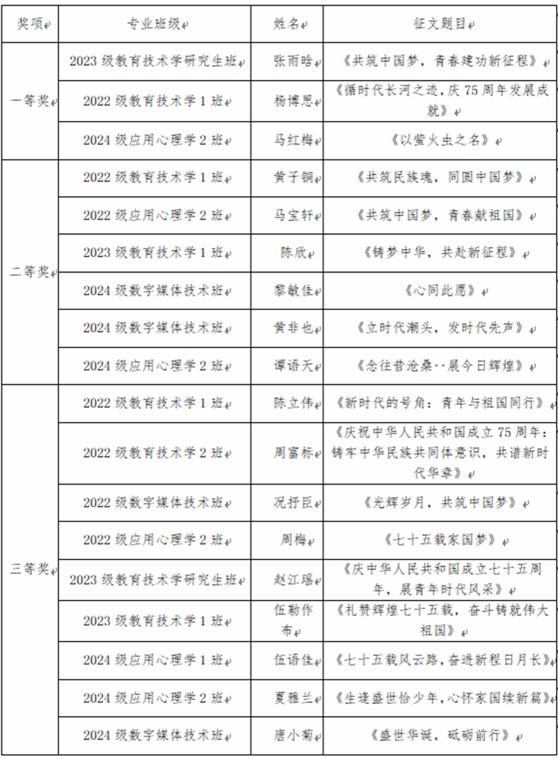 团委初审、专业教师评审,最终由2023级教育技术学研究生班张雨晗创作的《共筑中国梦,青春建功新征程》等3名同学征文荣获一等奖,2022级教育技术学1班黄子铜创作的《共筑民族魂,同圆中国梦》等6名同学征文荣获二等奖,2022级教育技术学1班陈立伟创作的《新时代的号角:青年与祖国同行》等9名同学征文荣获三等奖。具体名单如下: