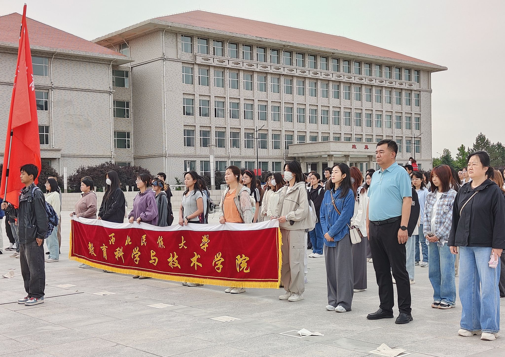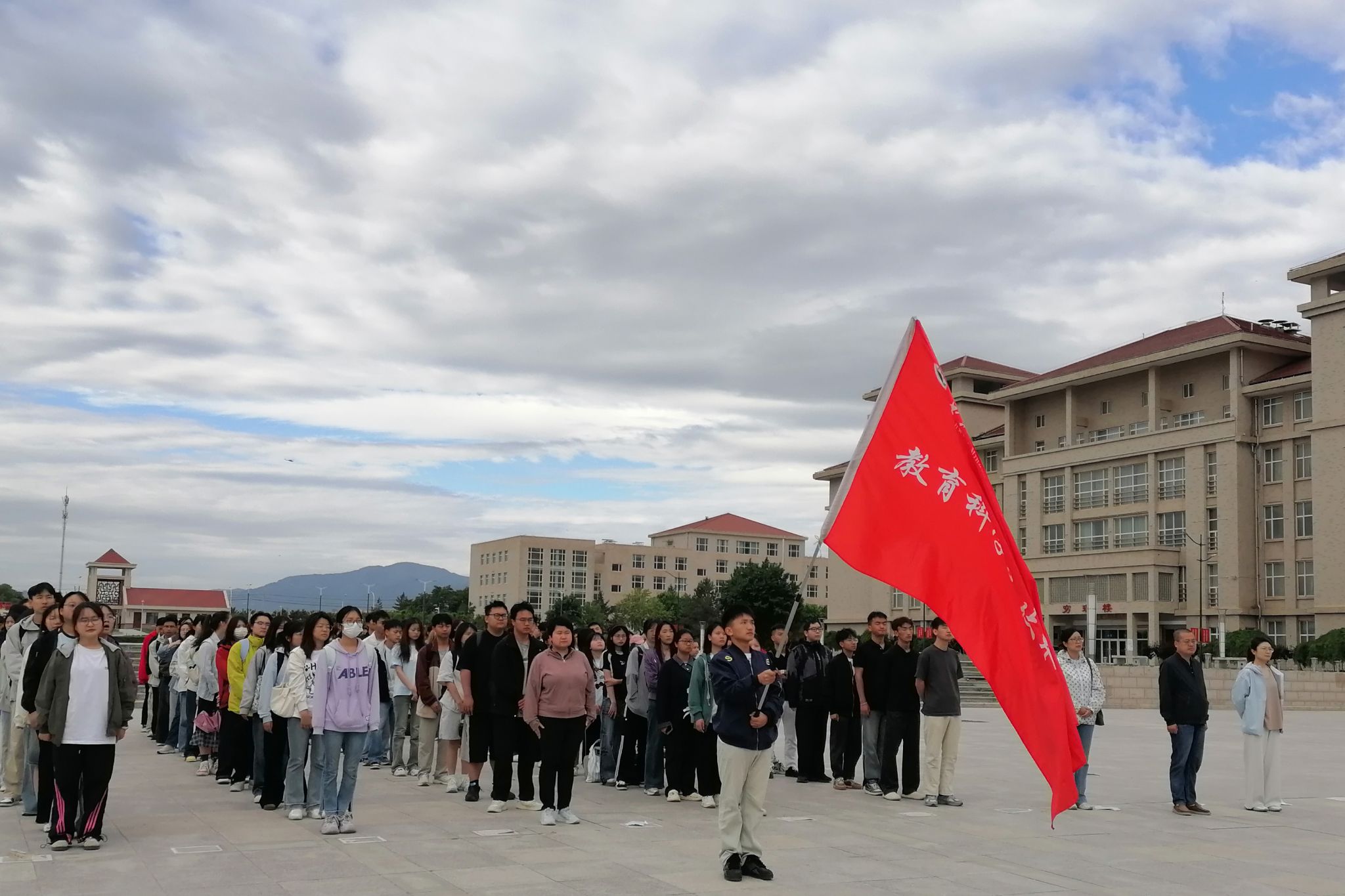 领导、辅导员、班导师及全体学生参加升旗仪式。