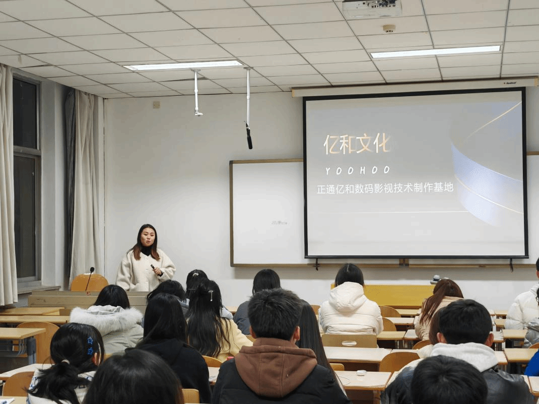 关欣宇女士向首先向学生介绍了企业基本情况、招聘岗位、办公环境及应聘流程等。同时就围绕“如何获得面试机会”,讲解了面试经验及面试所需注意事项。她欢迎同学们能够加入北京亿和文华数字技术有限公司。