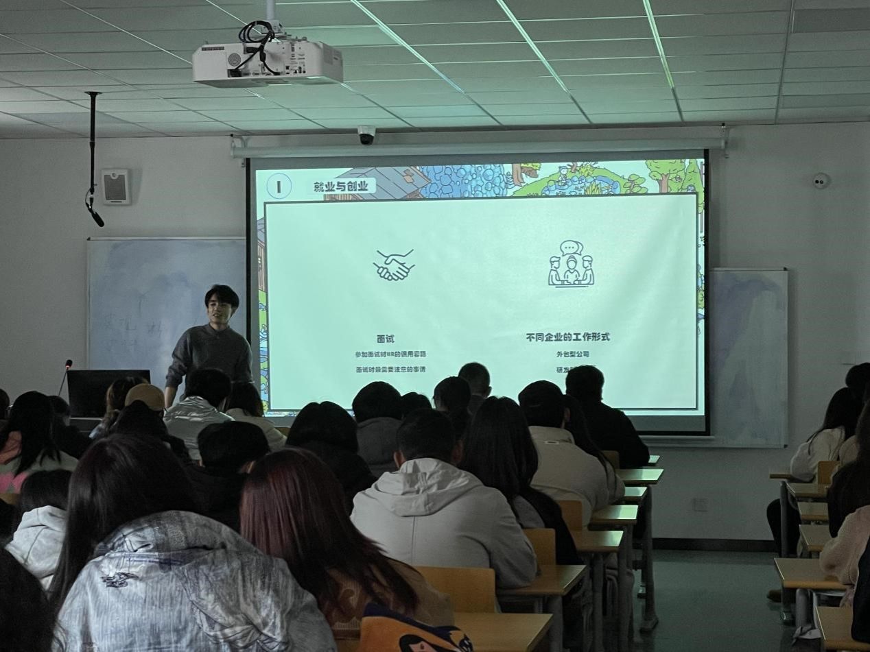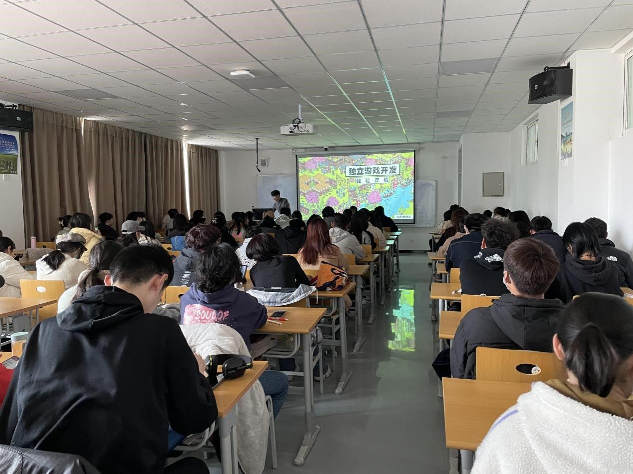 盛玟墉及其团队向同学们详细讲解了独立游戏商业模式与市场分析、游戏项目管理、游戏设计方法等内容,还以数字媒体技术专业学生创业、就业为原点与同学们进行互动讨论。