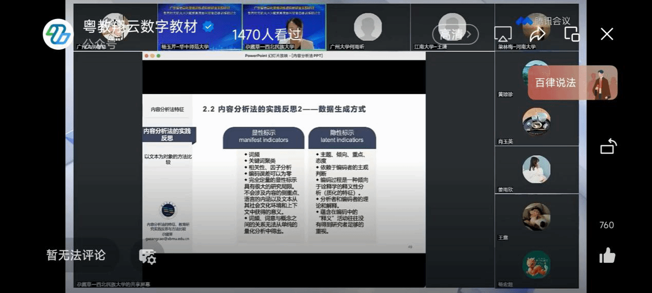 尕藏草教授做了“内容分析法的特征、教育研究实践反思与方法比较”的主题讲座,以跨学科的视角探析了内容分析法以文本为研究对象的特征、应用模式以及规范化问题等。在研讨环节与各位专家就内容分析法在智能时代的应用、内容分析法与其他研究方法的比较等话题展开了深入讨论。