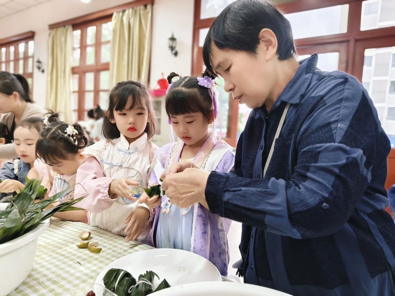 在民俗体验环节,老少同心齐上阵,大家围站在一起,大手帮小手,捋粽叶、填糯米、缠粽绳,一会儿功夫,一粒粒晶莹的糯米顺势编成了各式各样的漂亮粽子。大家一边包粽子,一边交流技巧和经验,共话端午习俗,欢声笑语不断,气氛融洽和谐。