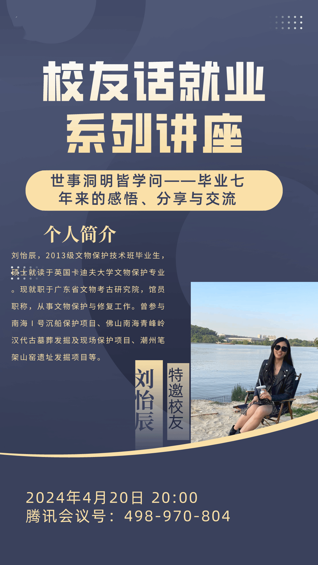 第二场分享会的主讲人是2017届校友刘怡辰,刘怡辰硕士就读于英国卡迪夫大学文物保护专业,现就职于广东省文物考古研究院。在此次讲座中,刘怡辰从专业素养培养、业务能力提升,以及业务能力之外的软实力等三个方面分享了她毕业后的就业的经验和感悟。
